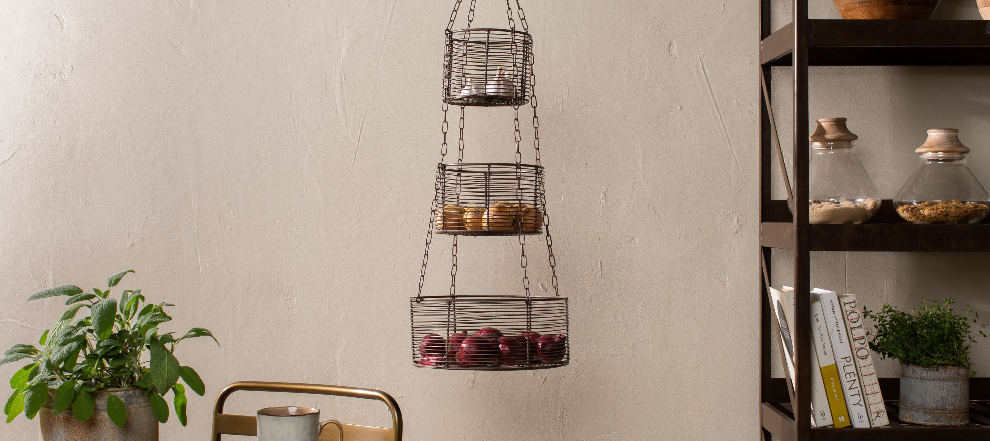Our Inkollu collection is another great option for pantry organisation and features metal basket bowls, hanging wire baskets, tiered wire stands, tiered storage stands and our wall-hung Inkollu spice rack. This timeless collection of ethically crafted storage solutions is made from aged brass wire creating a feeling of warmth as well as functionality. Our Tamba wall-hung shelving allows us to create functional yet eye-catching storage in the kitchen.