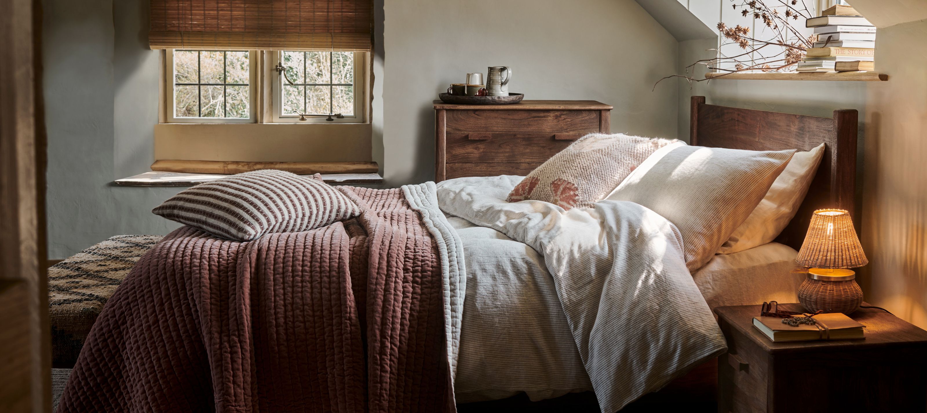 Whilst it is important to create a relaxing bedroom design that looks good, it shouldn’t be about form over function. The pieces we choose for our bedroom also need to be practical and support the way we want to live. They should be beautiful and useful. Take a solid wood bed for example. Our Anbu Acacia Bed is crafted from acacia wood in a deep walnut finish that is both stylish and practical. Not only is it robust and well made, it’s a design statement, rich with beautiful detail. Our perfectly proportioned Tubu antique brass table lamps have an adjustable head meaning the light can be carefully directed wherever it needs to go in a given moment to provide maximum illumination and comfort. Our Noko Rattan Wall Lamp is a work of stylish wall art in its own right, but also gives off a warm ambient glow, perfect for creating a relaxing and cosy atmosphere in the bedroom.