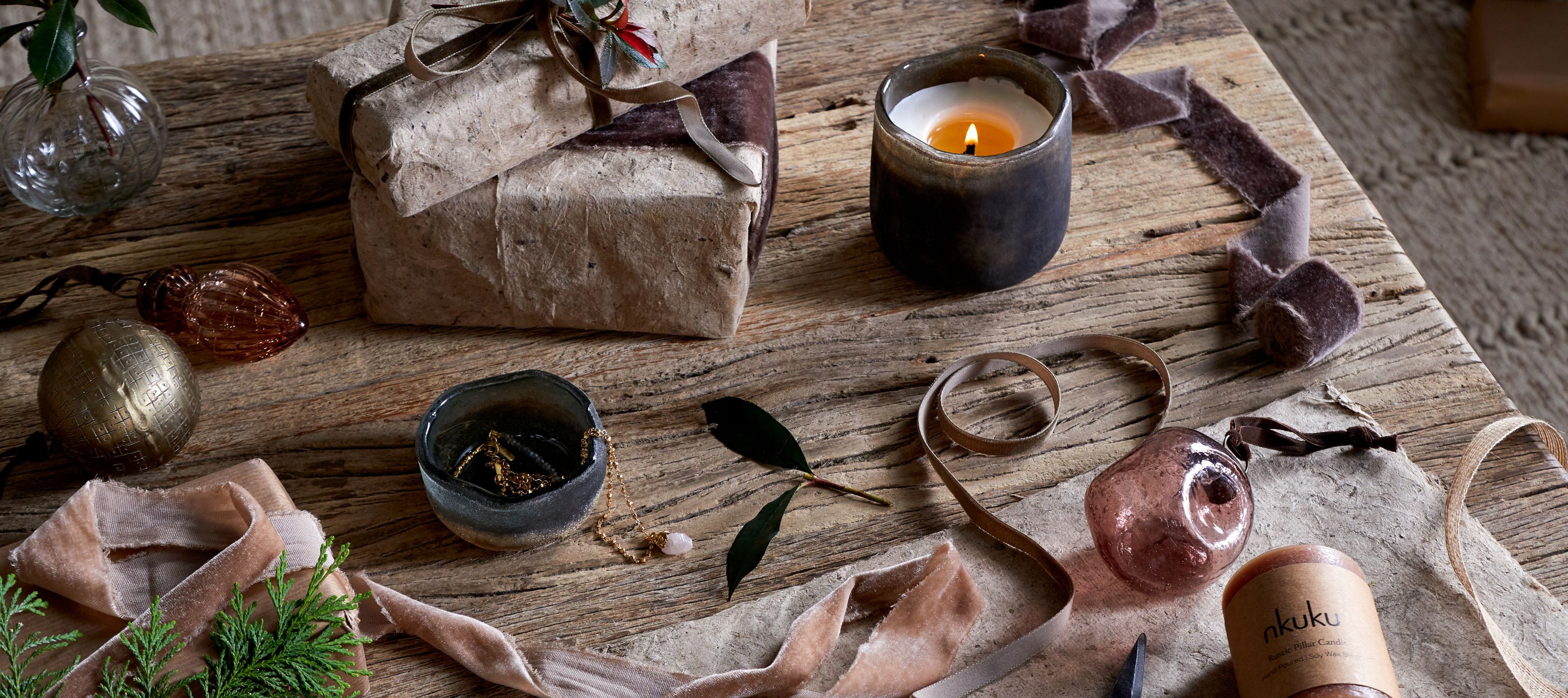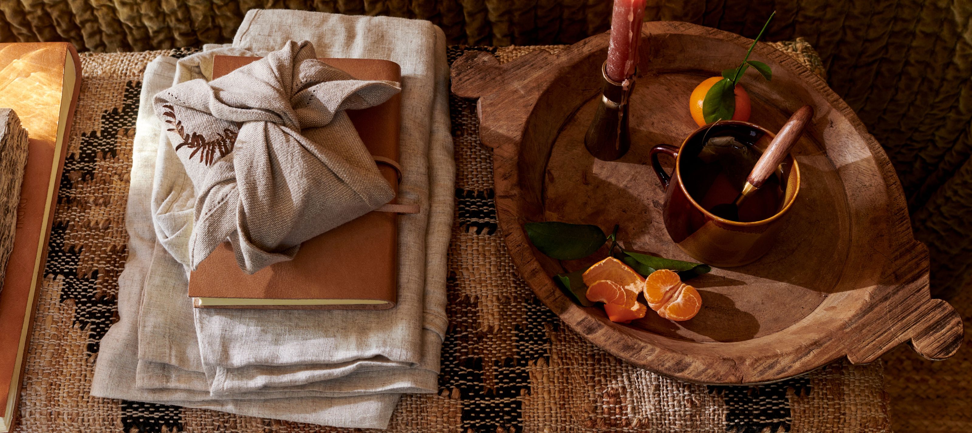 Old scarves, tea towels, linen napkins or even scraps from a sewing basket can all be given a new purpose. Wrap your gift using a furoshiki technique, the Japanese art of wrapping objects in cloth, and finish with a simple knot or bow. No tape, no waste, just fluid folds and natural textures.