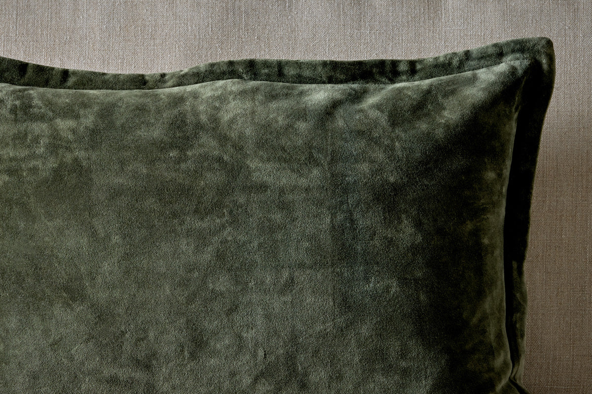 Luxurious and elegant, this cushion cover features a rich, thick velvet front in a beautiful deep green colour. Backed with natural linen and finished with a flange edge, it combines luxurious texture with durable craftsmanship. The fabric is woven on a loom, ensuring a soft, plush finish that brings both comfort and refined style to any seating area or bedroom. Available in two sizes and colours. Our feather cushion inners will accompany your cushion cover perfectly. Please note, the size of the cushion inner will display slightly larger than our cushion covers to allow for a plump finish when put together.