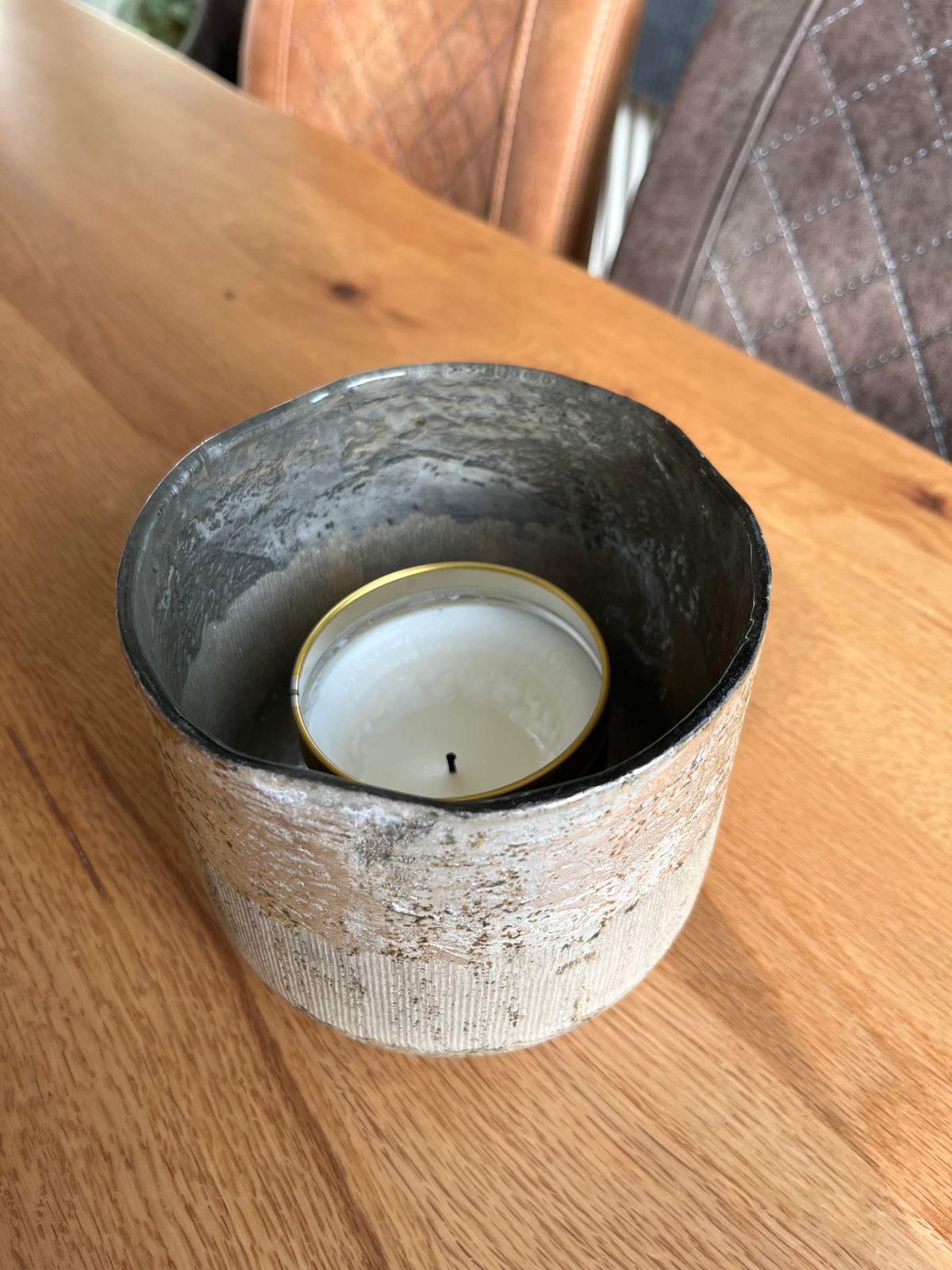 After reading reviews I knew this was going to be a large tealight holder (medium) but it’s the size of a small plant pot. I have used a tin candle with it as there is a slight dome in the bottom so a standard tealight doesn’t work, makes it unstable.