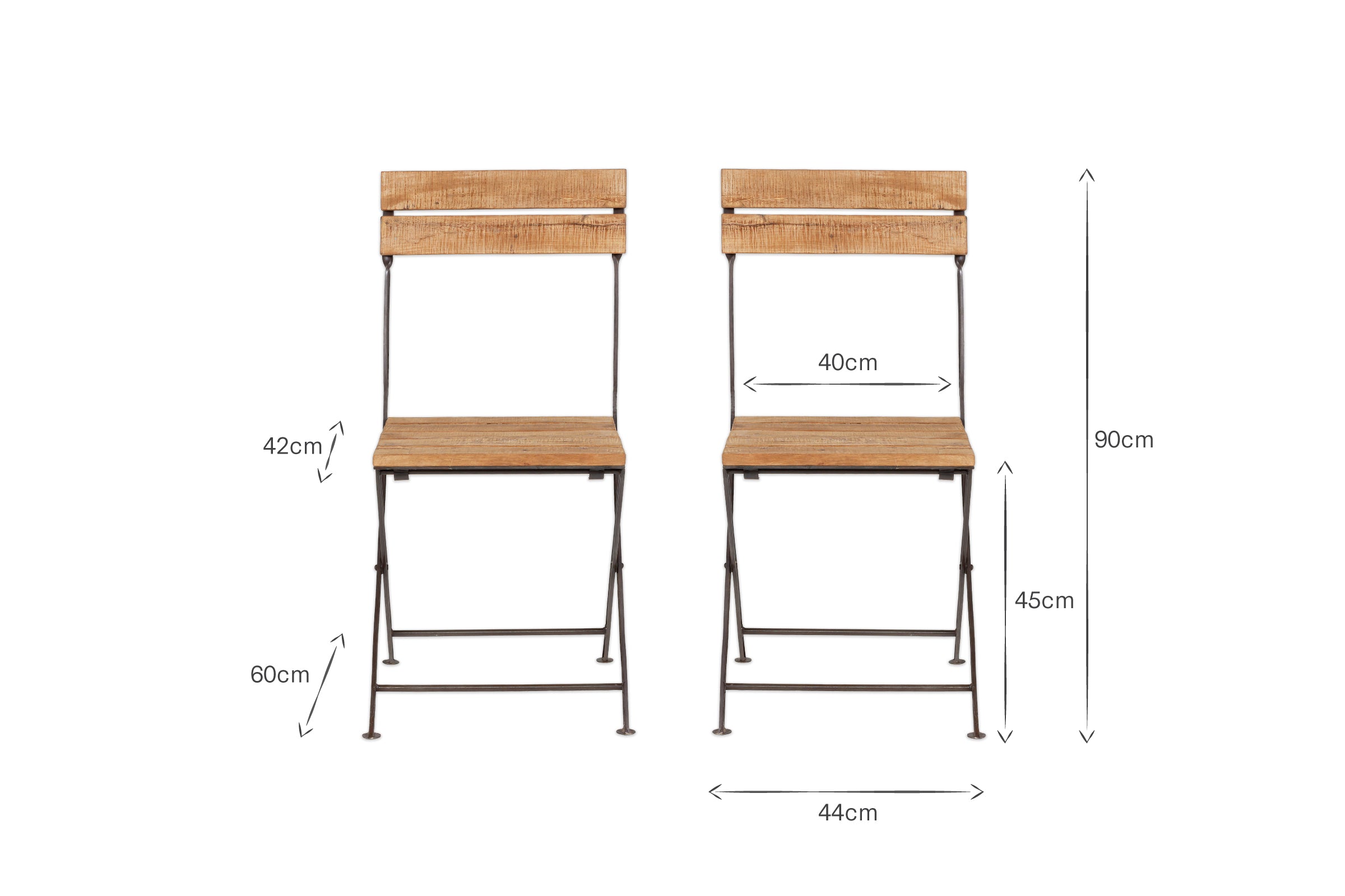 Our Rishikesh reclaimed wood bistro folding chairs are the perfect blend of two contrasting materials - characterful reclaimed wood and sleek iron. The warmth of the chairs slatted wooden seat and back help to soften the clean lines of the iron frame. The simple folding mechanism of these chairs makes them easy to store away, especially if space is limited. Complete the look by pairing these chairs with our elegant Rishikesh bistro table.