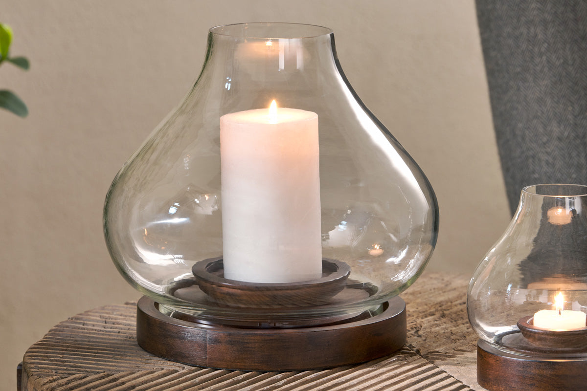 Perfect for atmospheric evenings, our stylish Naryla lantern has an elegant neck that slopes into a generous organic form and sits perfectly in its solid mango wood base. The contrasting glass and wood design creates a wonderfully tactile piece that brings understated style to a living space. Display on a sideboard or as a centre piece to a table and style with our rustic pillar candles.