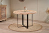 The Fia mango wood round dining table, is the perfect place to gather with family and friends. The industrial iron legs are purposeful, sturdy and well designed with a criss - cross at their base. The table top feels chunky and the natural grain of the wood provides a soft, natural patina. Mango wood has the added eco qualities of only being harvested once the trees have stopped bearing fruit and their short-growing cycle means they provide a supplementary income for local farmers. The Fia will comfortably seat four. The mango wood table top is finished with a sealant and matt lacquer.