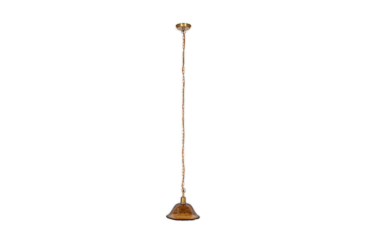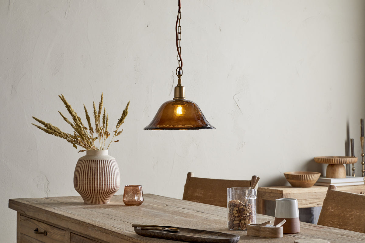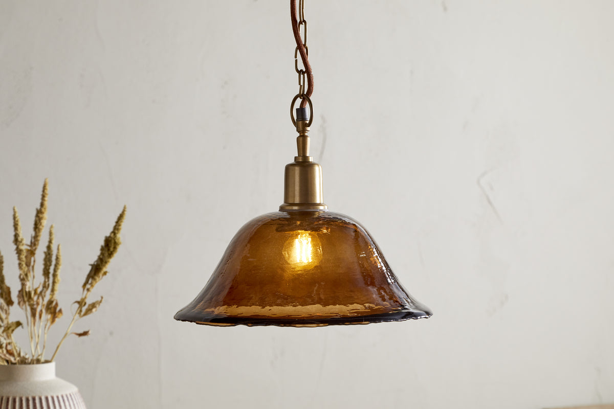 This pendant light features an organically shaped glass shade, finished with a soft lustre that catches the light beautifully. The warm tones of the glass are complemented by a rich antique brass ceiling plate, creating a refined, balanced look. Striking over a dining table or in an entranceway, it makes an elegant first impression. Available in clear or amber glass.