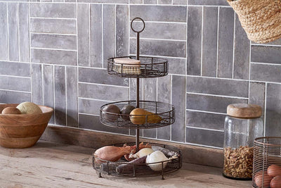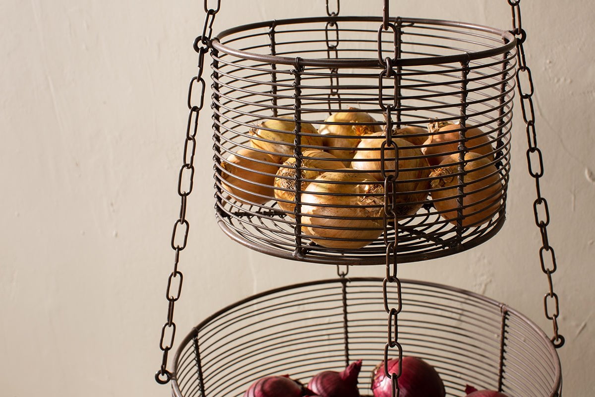 Our Inkollu hanging basket set combines style with practicality. Crafted from elegant wirework with a warm aged brass finish, its pared back and functional design brings a sophisticated touch to kitchen storage. The baskets are arranged as three tiers in differing sizes, each suitable for holding a wide variety of utensils, and the entire set is elegantly suspended from a practical hanging hook. These hanging baskets provide an easy and clutter-free way for you to access your kitchen accessories.