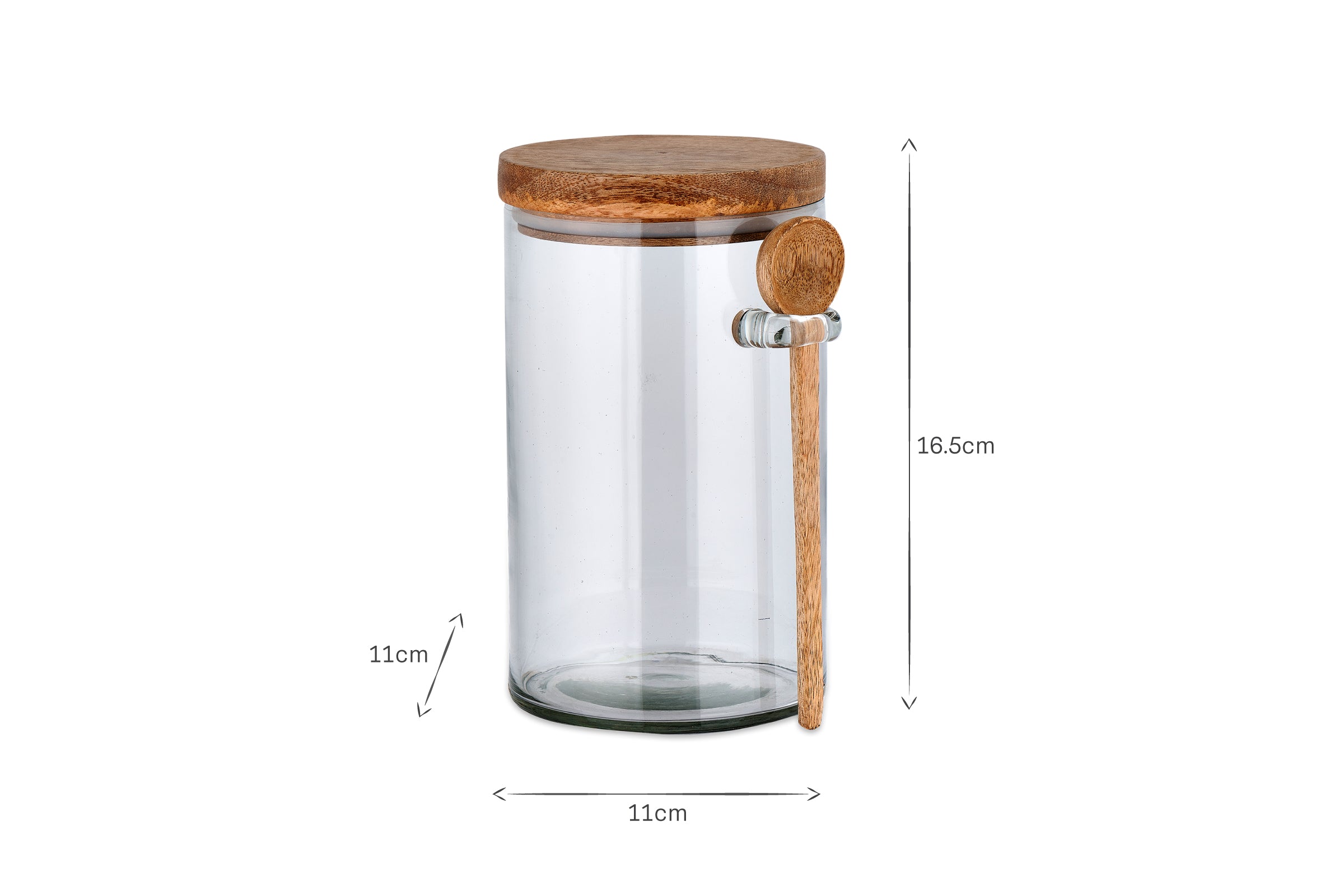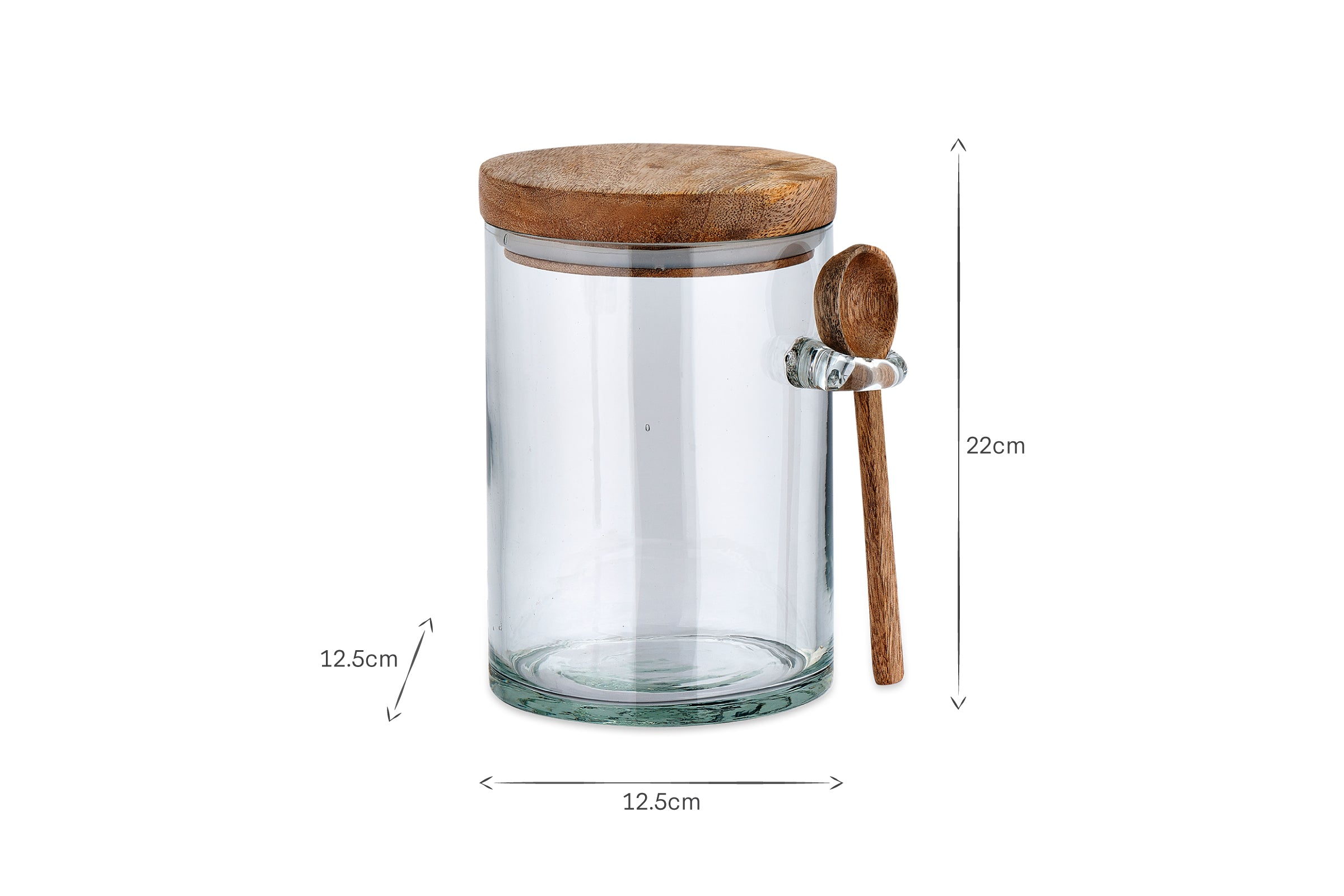 Style your pantry or kitchen shelves with these attractive Kossi storage jars. The recycled glass jar has a solid mango wood top and stylish glass loop for an accompanying wooden spoon.