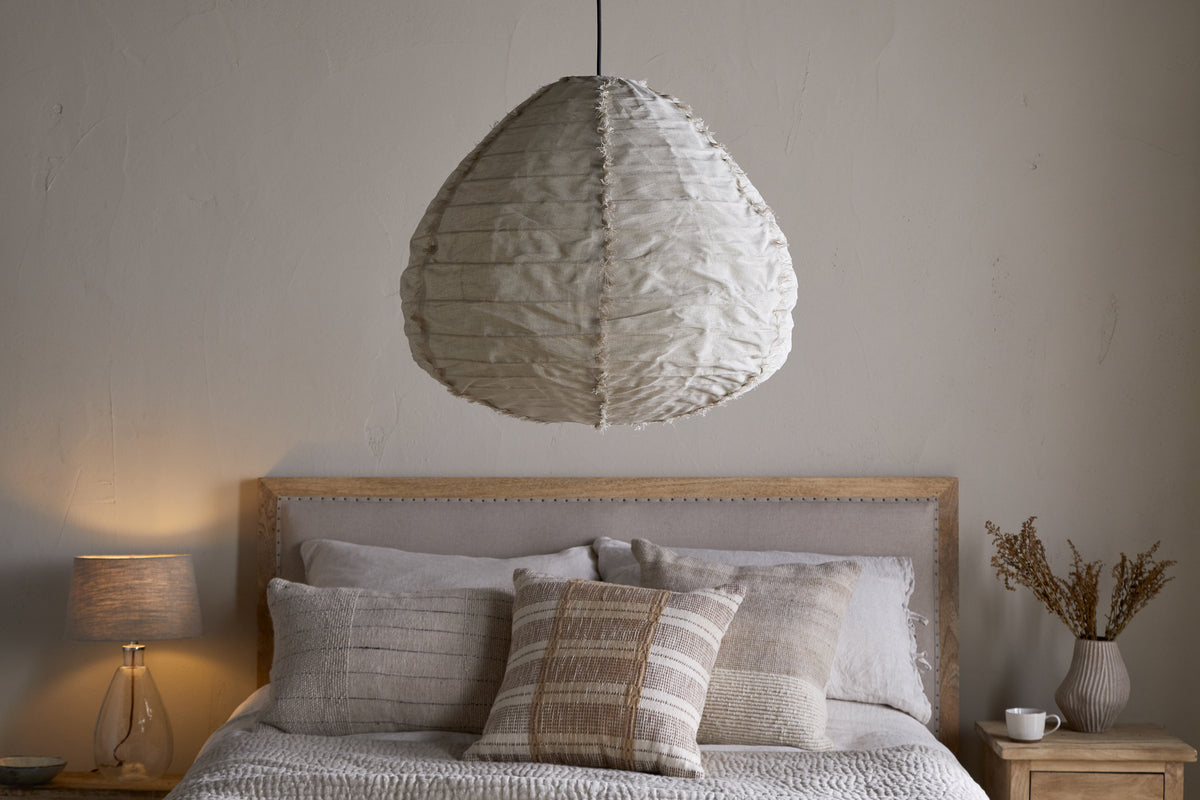 Our Hartaj Cotton lampshade is the epitome of softness, making it the perfect addition to your bedroom or cosy space. Designed for easy installation, it can be fitted to an existing pendant or used with our Otti pendant fitting, no electrician required. The textured cotton beautifully diffuses light, creating a warm and inviting glow. This understated yet stunning shade makes an ideal bedroom light.