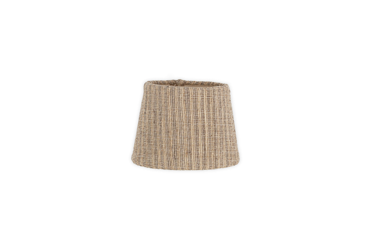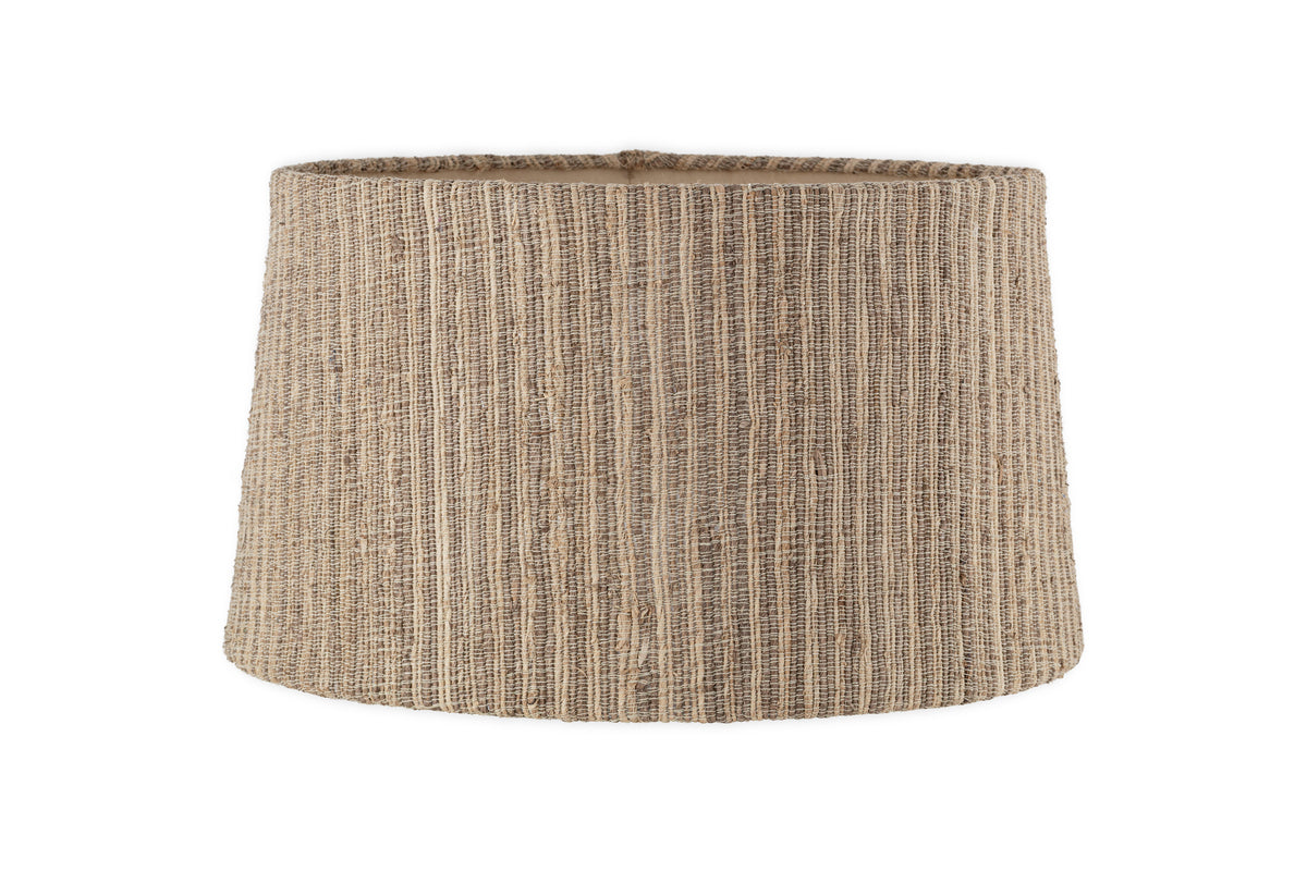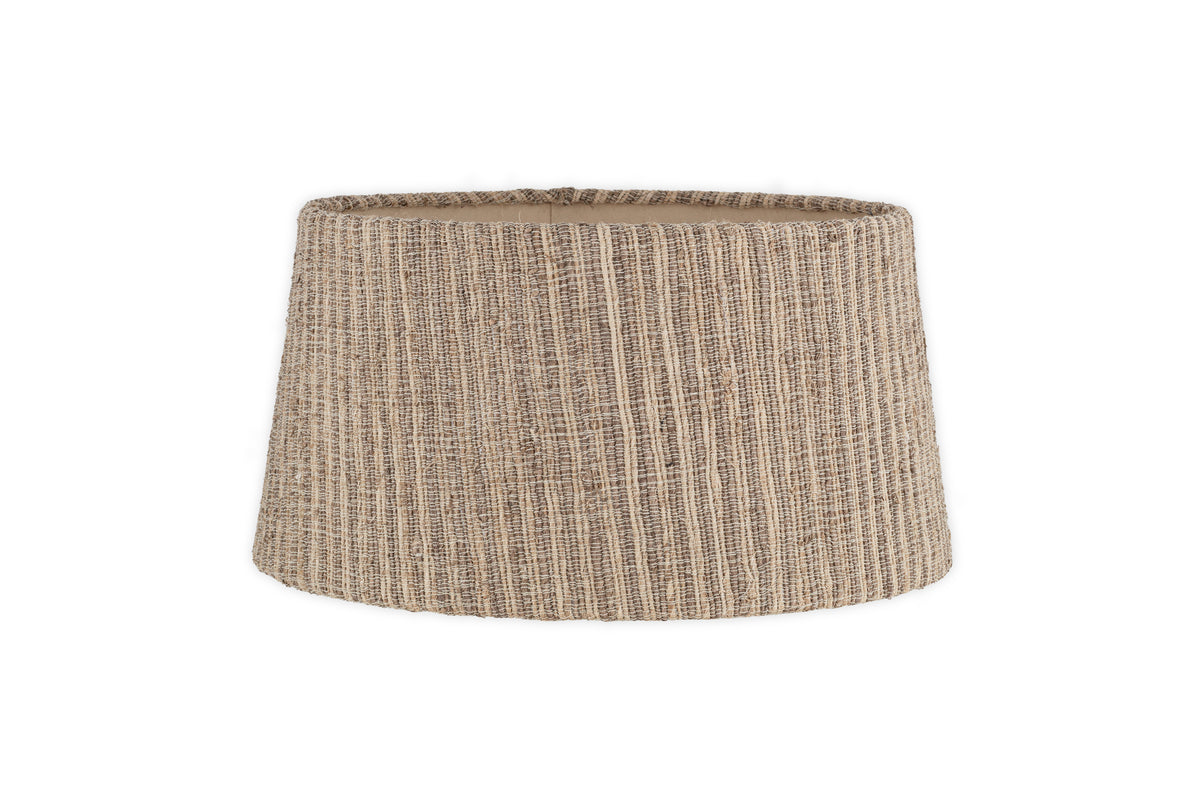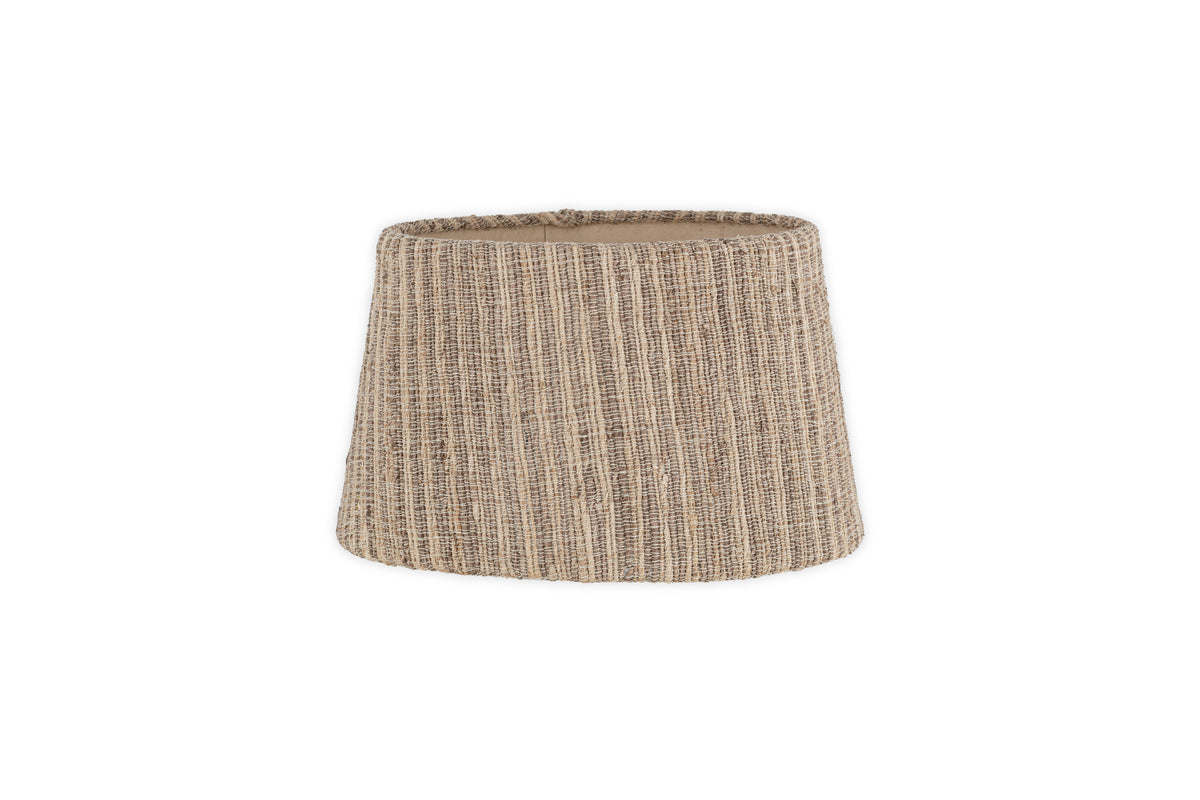 This lampshade is crafted from a woven fabric made using banana leaves, a sustainable material known for its strength and durability. The fabric is stitched by hand around a metal frame, combining natural fibres with skilled craftsmanship.