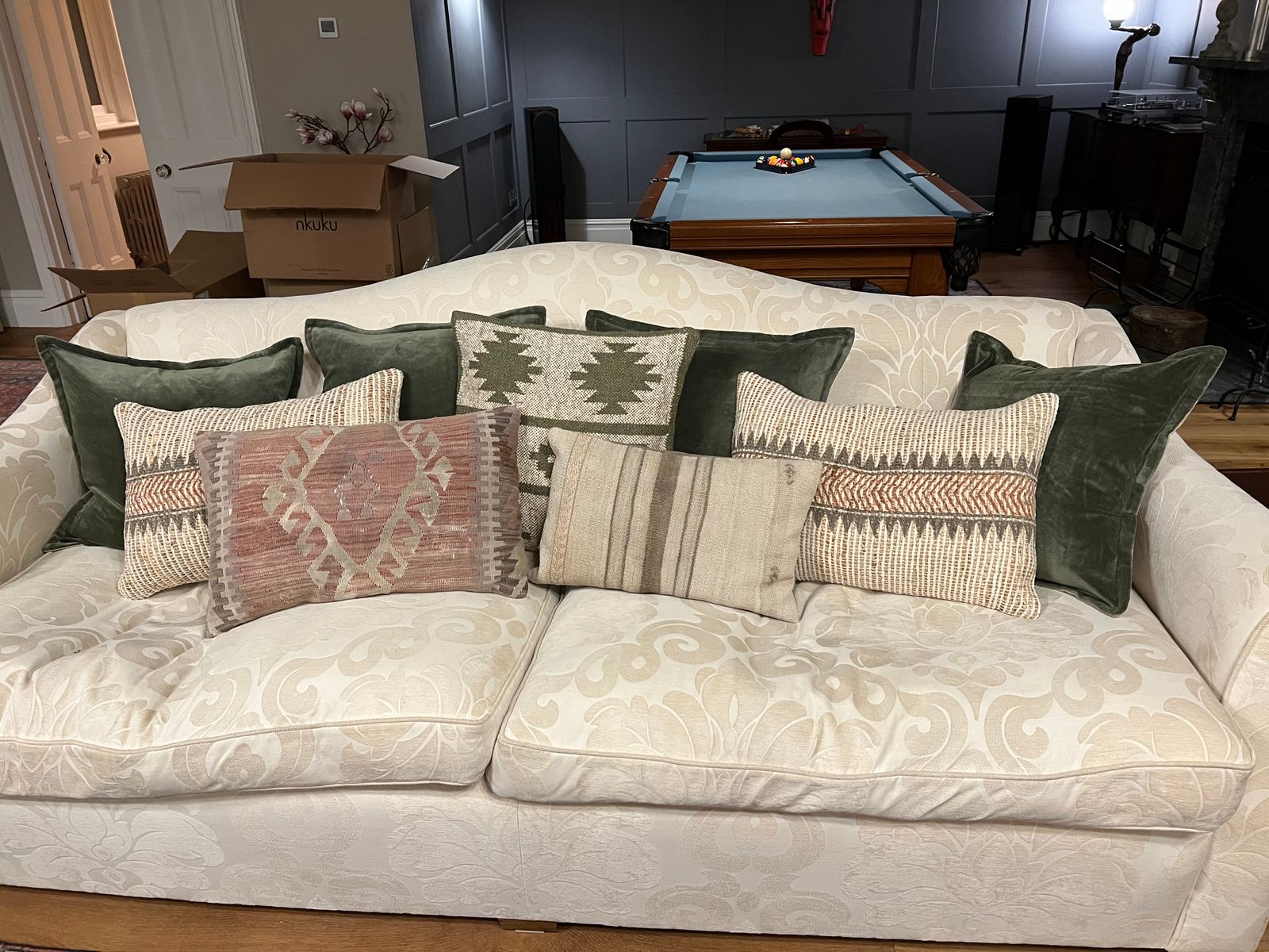 Luxurious and elegant, this cushion cover features a rich, thick velvet front in a beautiful deep green colour. Backed with natural linen and finished with a flange edge, it combines luxurious texture with durable craftsmanship. The fabric is woven on a loom, ensuring a soft, plush finish that brings both comfort and refined style to any seating area or bedroom. Available in two sizes and colours. Our feather cushion inners will accompany your cushion cover perfectly. Please note, the size of the cushion inner will display slightly larger than our cushion covers to allow for a plump finish when put together.