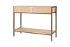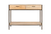 The natural tones of the Dasai wooden console table provide a neutral aesthetic. The piece is crafted from mango wood, a sustainable wood that has an interesting natural grain. The sandblasted finish adds texture and character. The Dasai console has a solid iron framework, that complements the wood and brings a contemporary look to the piece. The practical lower shelf is ideal for storing baskets or objet. The Dasai console table has two drawers that each have a rolled iron bar handle, forged from solid iron using age old techniques. This piece exudes quality and durability.