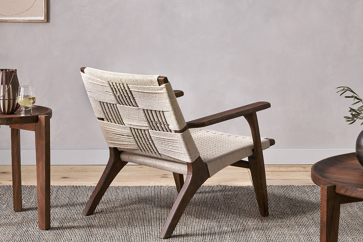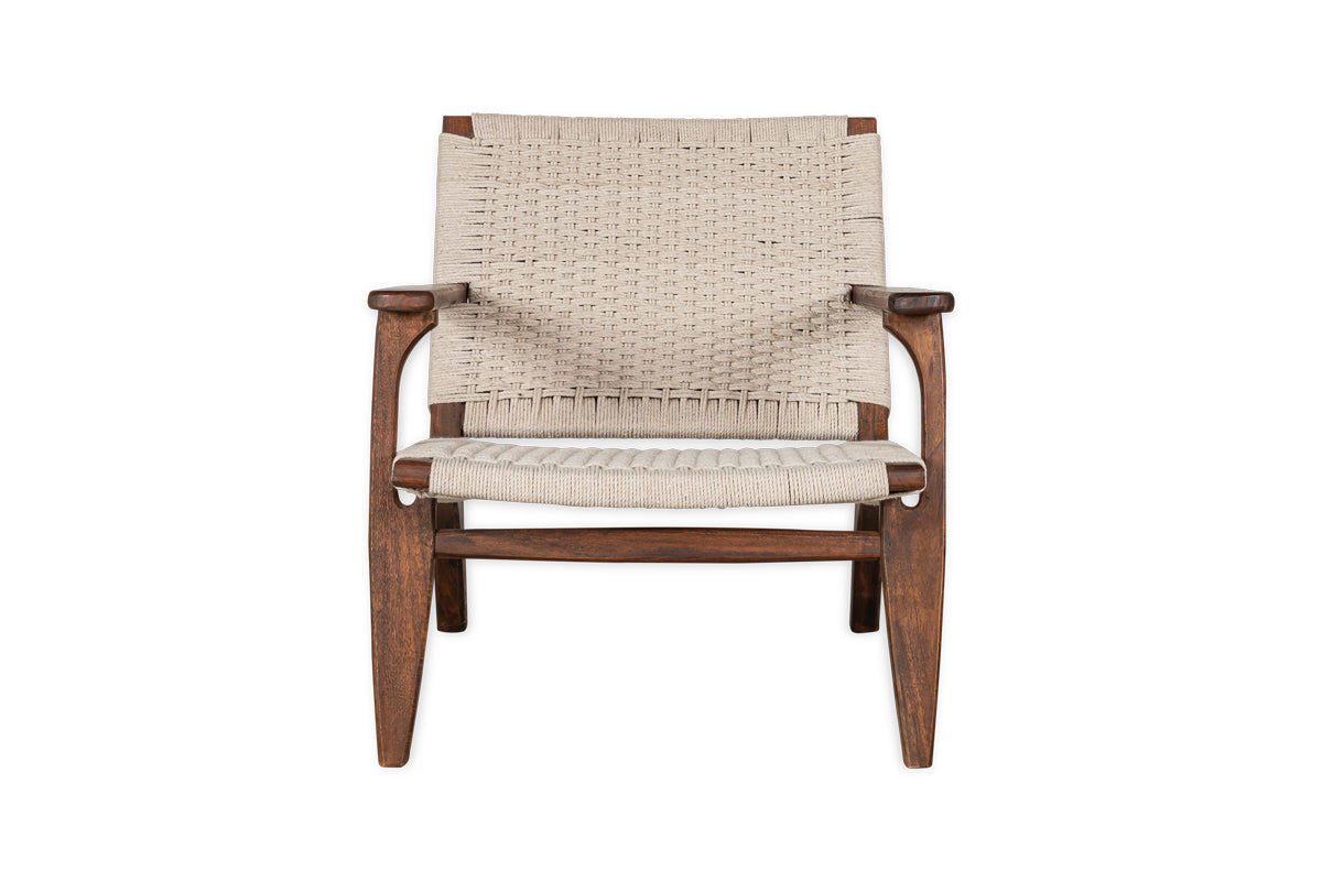 This simple lounger is made from acacia wood which we love for its warm natural tones and beautiful grain. The simple, timeless design is generously sized for maximum comfort and the seat and back support is made from hand-woven cotton rope in a natural tone that effortlessly complements its wooden structure.