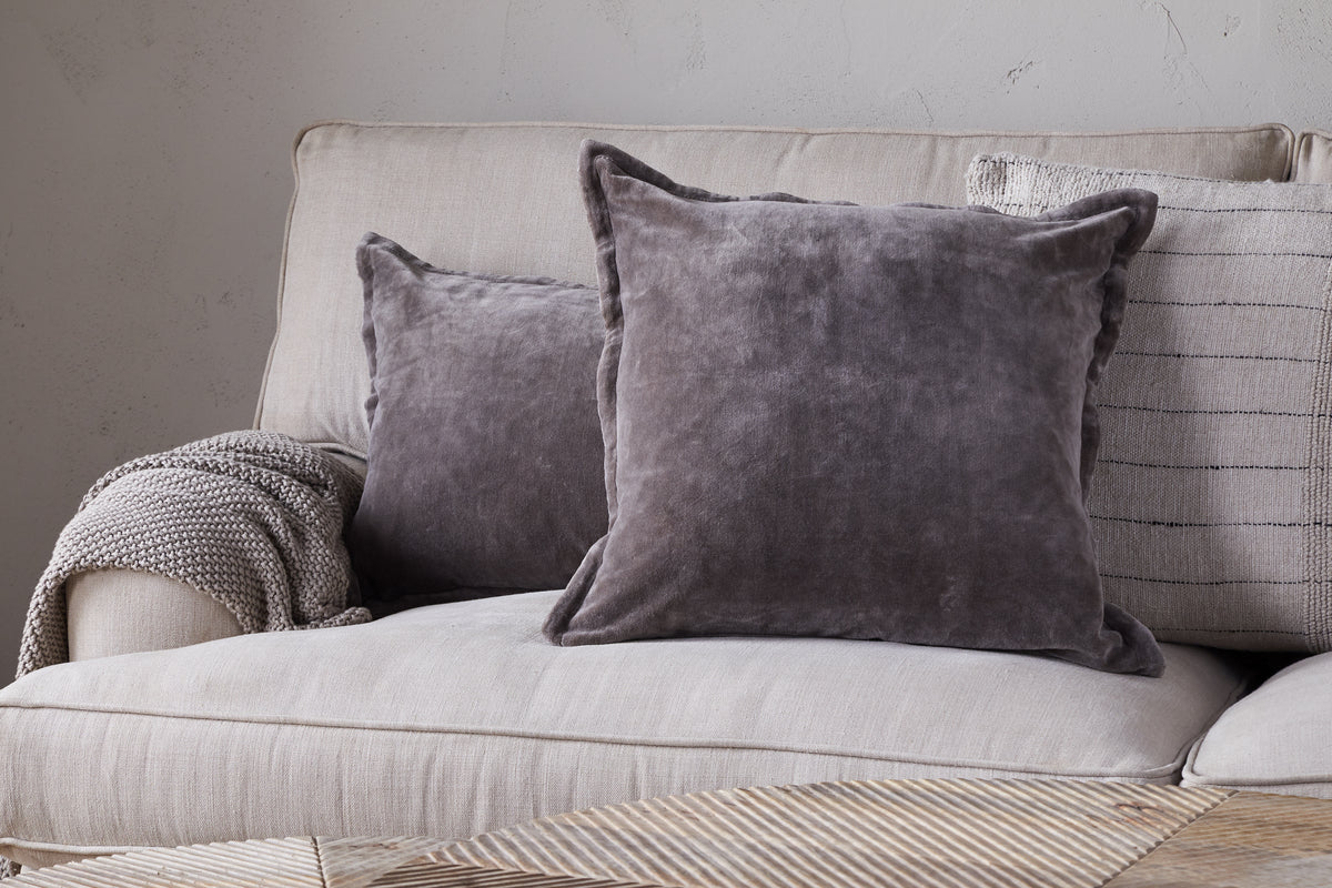 A light beige sofa styled with two large gray velvet pillows, nkukus Dhara Velvet Cushion Cover in Charcoal, a textured gray throw blanket, and a cream pillow with thin black stripes creates a cozy, modern living room vibe.A beige sofa with two nkuku Dhara Velvet Cushion Covers in charcoal, a textured gray knit blanket over the arm, and a beige pillow with black stripes, all set against a light wall.Two nkuku Dhara Velvet Cushion Covers in charcoal, featuring visible seams, rest against a light beige fabric backdrop for a soft and cozy look with an elegant touch.Close-up of two nkuku Dhara Velvet Cushion Covers in charcoal, resting on a light-colored fabric surface. The visible velvet texture gives each cover a plush, cozy, and decorative look.A soft, square, dark gray blanket or throw lies flat on a white background with plush, smooth texture—an ideal match for the nkuku Dhara Velvet Cushion Cover in Charcoal to create cozy decor.The nkuku Dhara Velvet Cushion Cover in charcoal is a rectangular, dark gray decorative cover with a soft, plush texture and slightly raised edges, offering stylish comfort for any space. Shown here against a white background.Dhara Velvet Cushion Cover - CharcoalDhara Velvet Cushion Cover - Charcoal