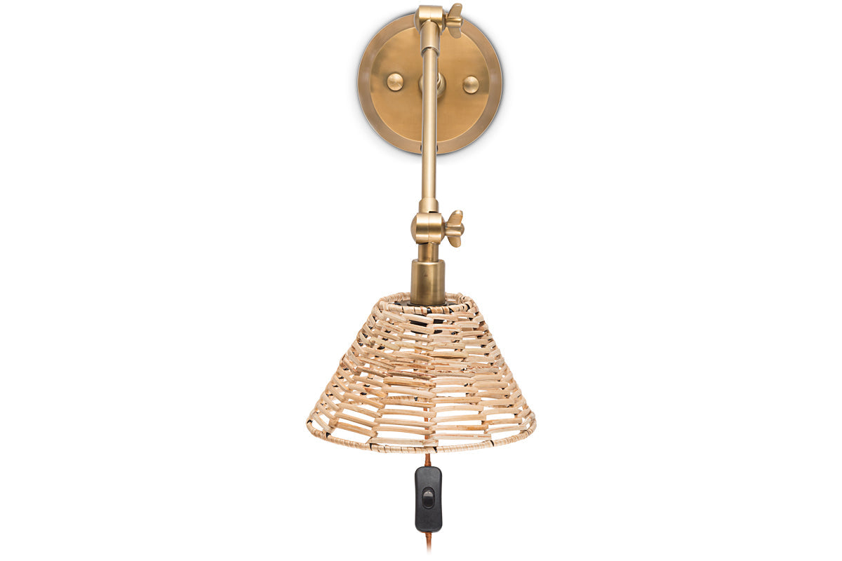 Skilfully handwoven using age-old techniques, the rattan shade has an organic aesthetic which is rich in character and texture. This design also lets the light shine through the gaps in the weave, creating a warm ambient glow. The natural tones of the rattan are complemented by the antique brass finish of the arm. This lamp can be plugged in eliminating the need for an electrician. Position as a pair on either side of a bed for an eye-catching display.