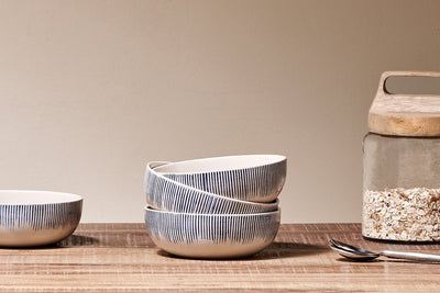 Our Karuma Ceramic short mugs have a distinctive and striking design. The thin blue lines are first etched into the clay then hand painted. This collection is handmade in north Vietnam using age - old methods. The collections are painted and shaped by hand incorporating indigenous and contemporary influences.