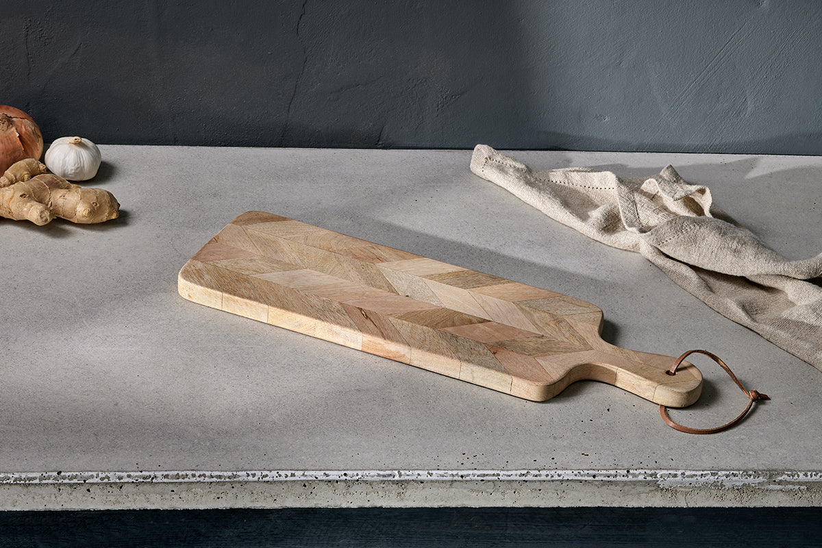 These long, rectangular, Nalbari Chopping Boards are striking and practical. Skilfully pieced together from segments of sustainable mango wood, the natural colour variations create an interesting and texture rich patchwork. Use them as a chopping board or sharing platter for informal delights from antipasti to artisan breads.