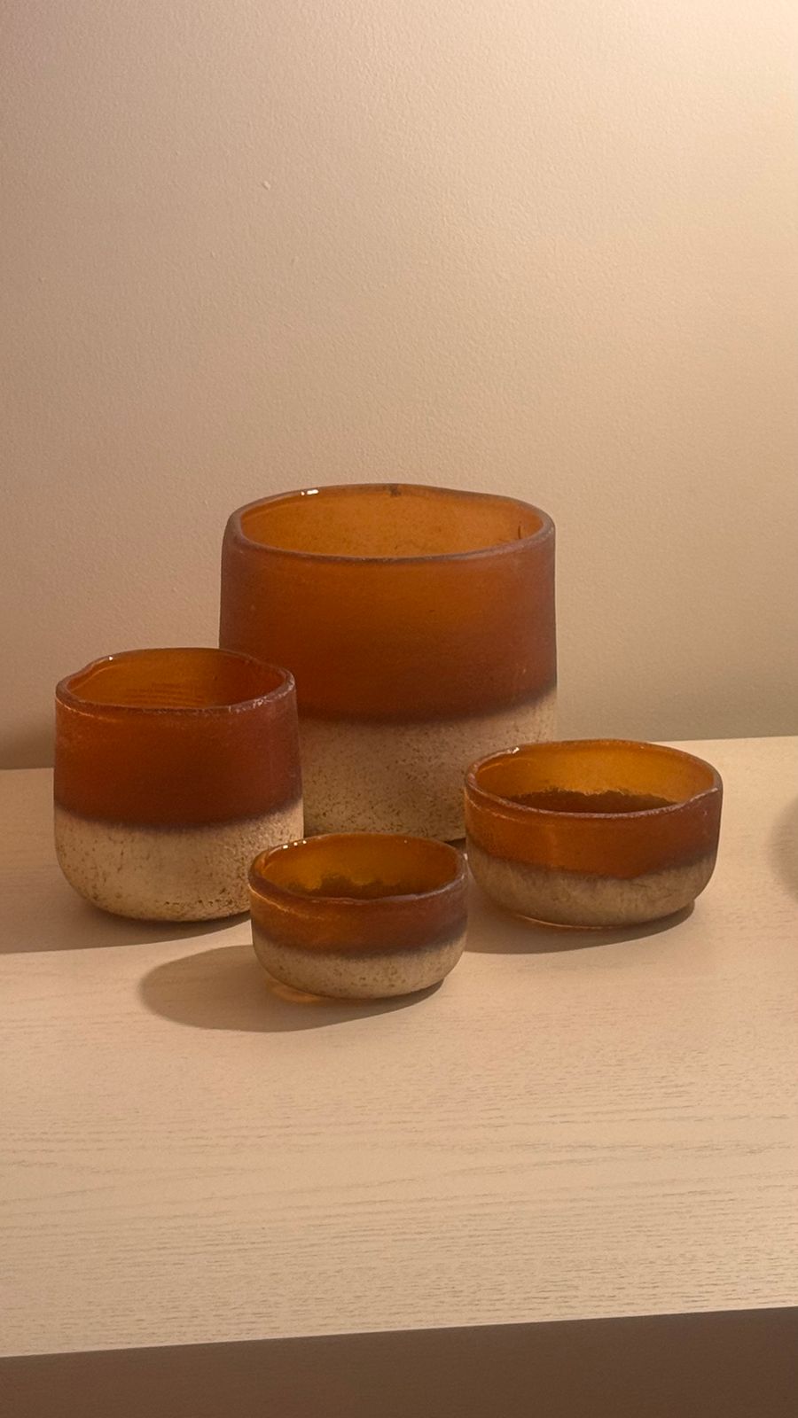 An autumnal update on our classic Ngolo tealight holder, the warm amber hues and textured rustic finish of this design are created from recycled glass, skilfully hand blown into striking organic forms. When lit, they add a beautiful soft glow for an inviting living space exuding peace and tranquillity. Available in three sizes, ideal for grouping together or dotting along a table or a sideboard.