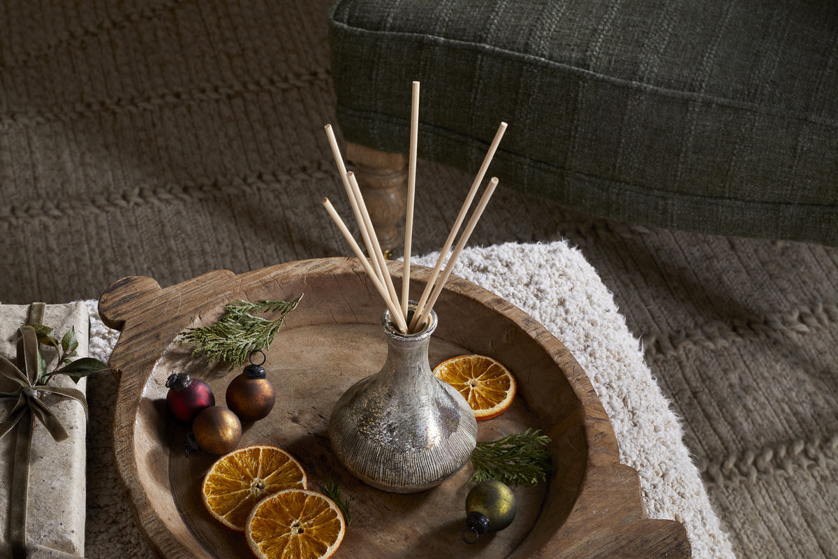 Made in the UK by a family-run business, this reed diffuser features a bespoke fragrance created exclusively for Nkuku. A timeless blend of traditional spiced mandarin, warming clove, and woody cinnamon evokes the joyful scent of the festive season. The vessel is finished in one of Nkuku's iconic textured styles and is designed to be reused as a small vase once the fragrance has dispersed.