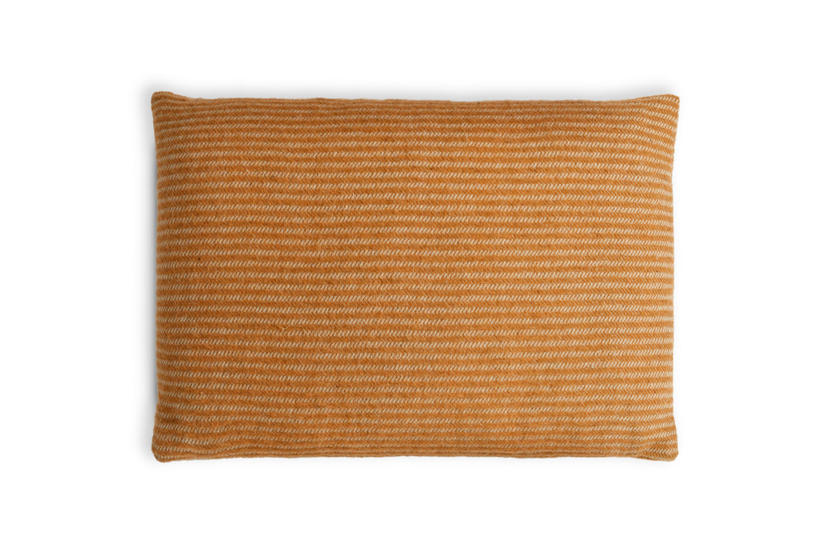 We choose to work with natural, recycled and reclaimed materials across all our pieces and the wool for our Sanval collection is no exception. The woollen yarn, initially dyed in Italy, travels to Portugal where it is expertly woven on small antique looms. After weaving, the wool undergoes a meticulous carding process to enhance its texture, then it is washed with gentle softeners. This careful treatment ensures each cushion has a luxuriously soft touch, embodying the quality and craftsmanship inherent to our ethos.