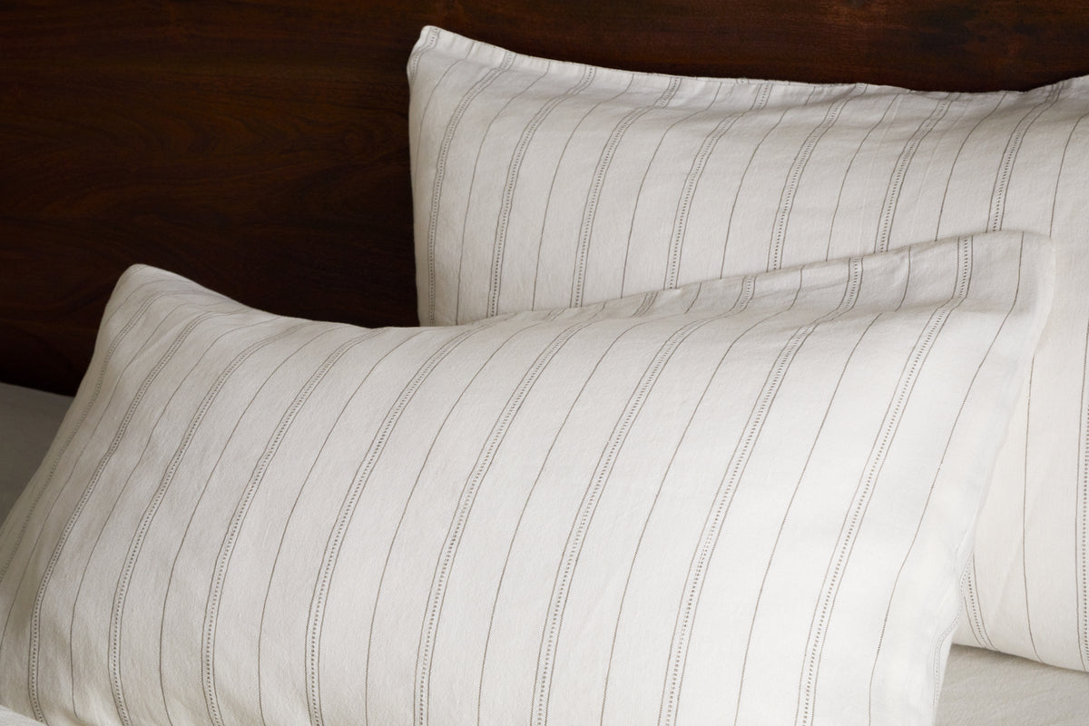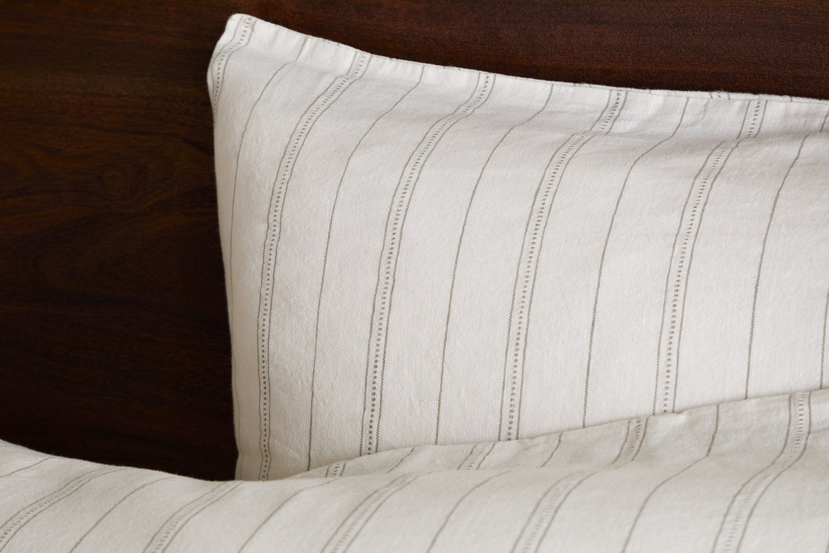 Two white pillows with thin, vertical gray stripes rest against a dark wooden headboard. Pair them with nkuku’s Anta Hemp & Cotton Housewife Pillowcases in Sage Green for a fresh touch. A matching striped blanket is partially visible below.Two pillows in nkukus Anta Hemp & Cotton Housewife Pillowcases in sage green are neatly arranged against a dark wooden headboard, with one pillow slightly overlapping the other.A close-up of a bed with white, thinly striped gray bedding and nkukus Anta Hemp & Cotton Housewife Pillowcases in sage green, set against a dark wooden headboard.Close-up of nkukus Anta Hemp & Cotton Housewife Pillowcases in sage green, featuring a visible soft texture and slightly wrinkled surface.A square, light beige rug with thin vertical dark stripes pairs beautifully with nkuku’s Anta Hemp & Cotton Housewife Pillowcases in Sage Green for a calming, natural look on a plain white background.The Anta Hemp & Cotton Housewife Pillowcases by nkuku feature a square shape in sage green, crafted from a hemp-cotton blend for comfort and style.The nkuku Anta Hemp & Cotton Housewife Pillowcase in sage green features a brown button closure and is showcased centered on a white background.Anta Hemp & Cotton Housewife Pillowcases -  Sage Green