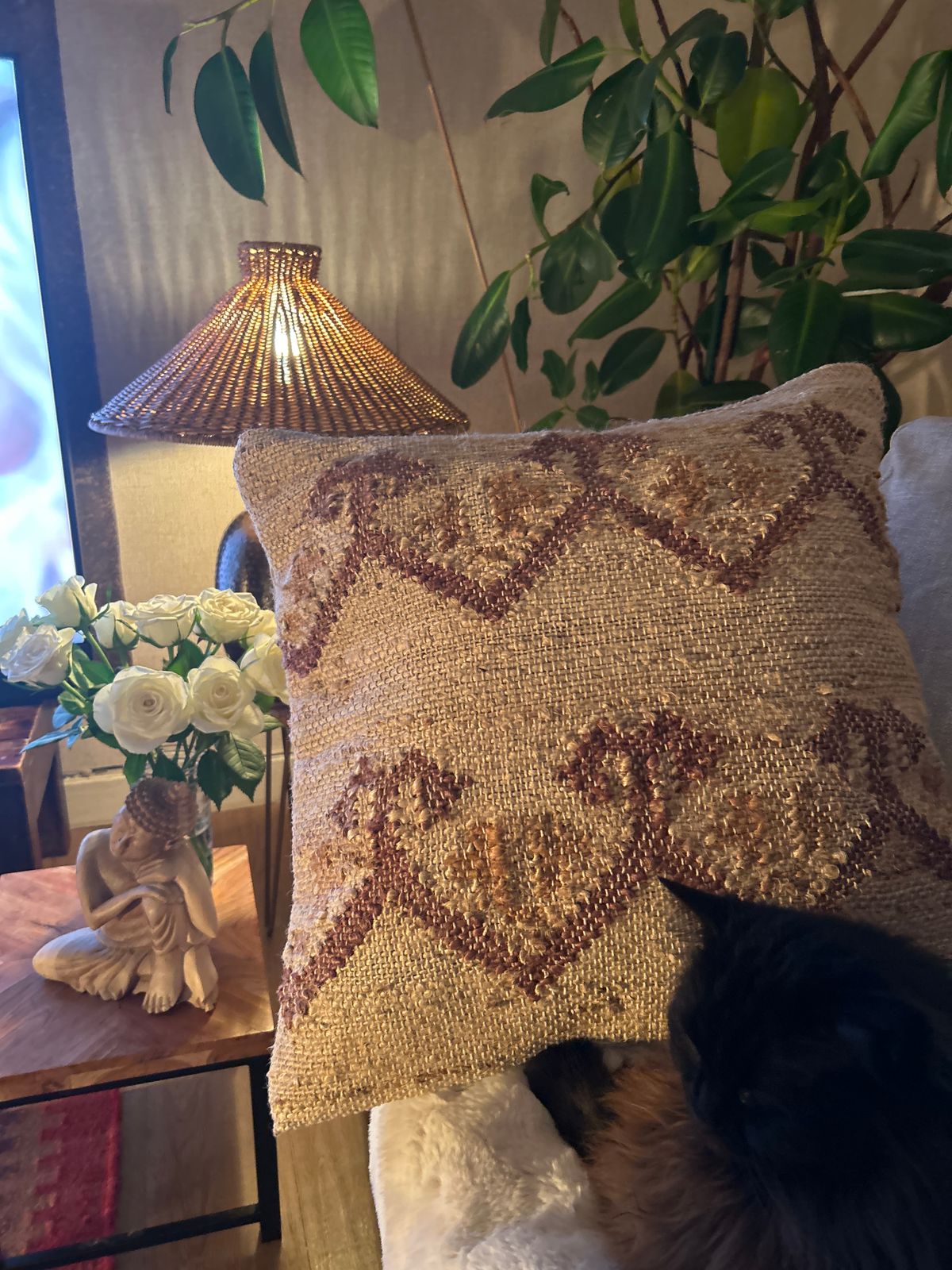 Taking inspiration from the textiles of India and skilfully woven on a traditional handloom, our Nuvali cushion cover blends the natural materials of jute and cotton for an ideal mix of comfort and durability. Its traditional Indian design, rendered in muted rust and earth tones, makes for an eye-catching addition to a sofa or armchair, and is an easy way to give soft furnishings an update. Please note, this is the outer cover only. Available in two sizes. Our feather cushion inners will accompany your cushion cover perfectly. Please note, the size of the cushion inner will display slightly larger than our cushion covers to allow for a plump finish when put together.