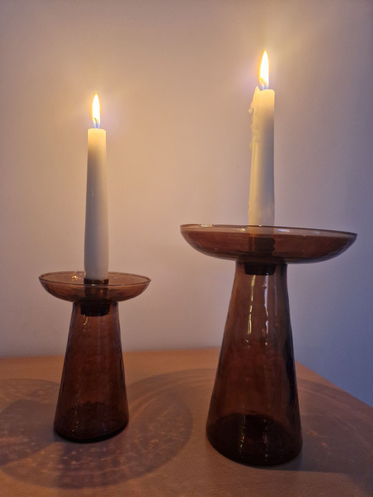 Our enchanting Avyn smoke amber glass candle holder is a simple yet sophisticated piece that is as sculptural as it is functional. The appealing tones of the amber coloured glass flatter the smooth and elegant contours and tapered base of the holder. Designed to hold a dining candle, style in pairs for a traditional dining table setting or mixed sizes for a more creative display. Each glass candle holder is crafted from recycled glass. Also available in a smaller size. Style with our pillar candles.