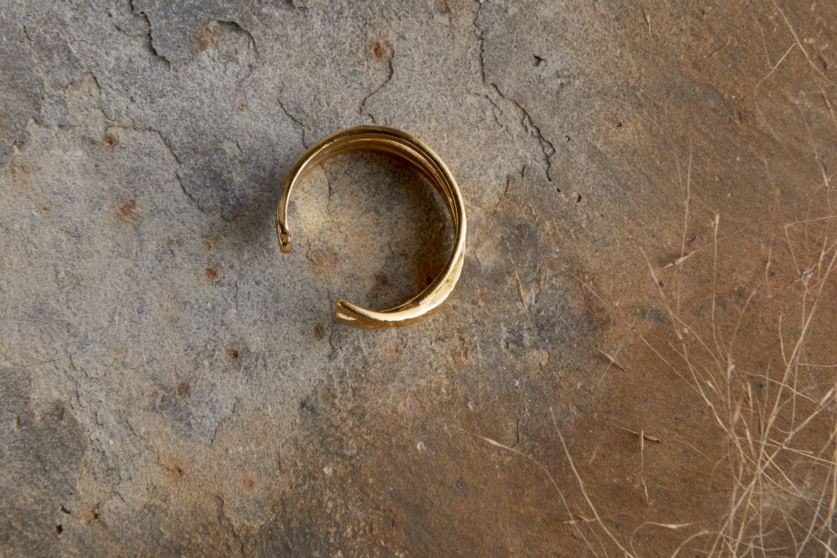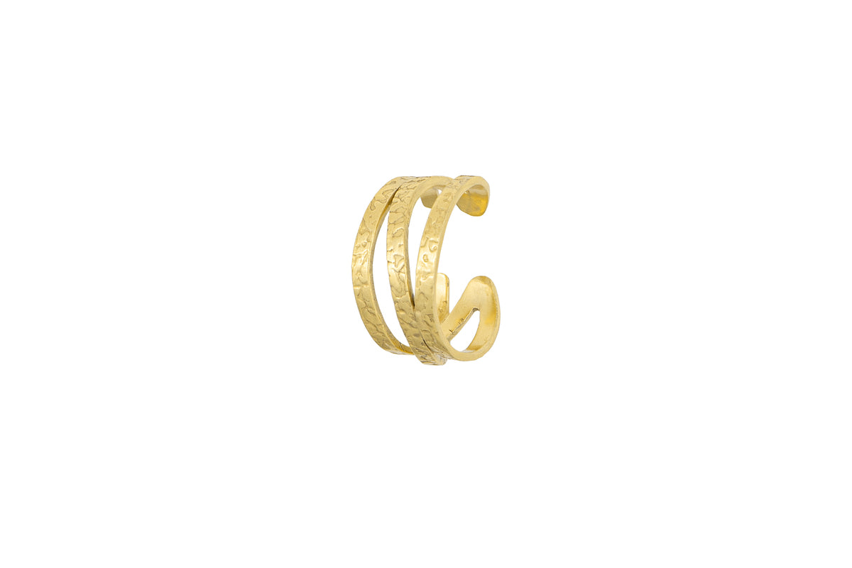 Each ring is hand-cut and hammered from a durable brass alloy, shaped with care to create its distinctive form. The textured surface is achieved through traditional techniques, adding depth and character to every piece. A gold-coloured finish completes the process.