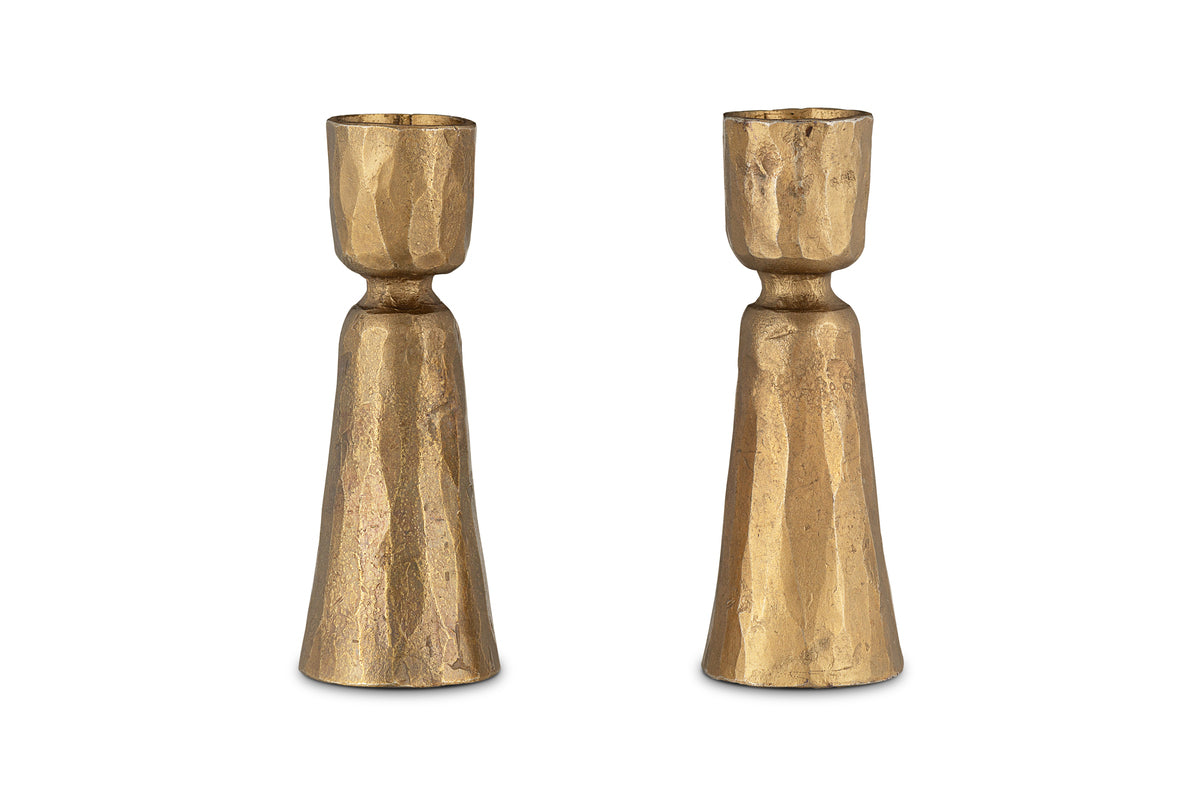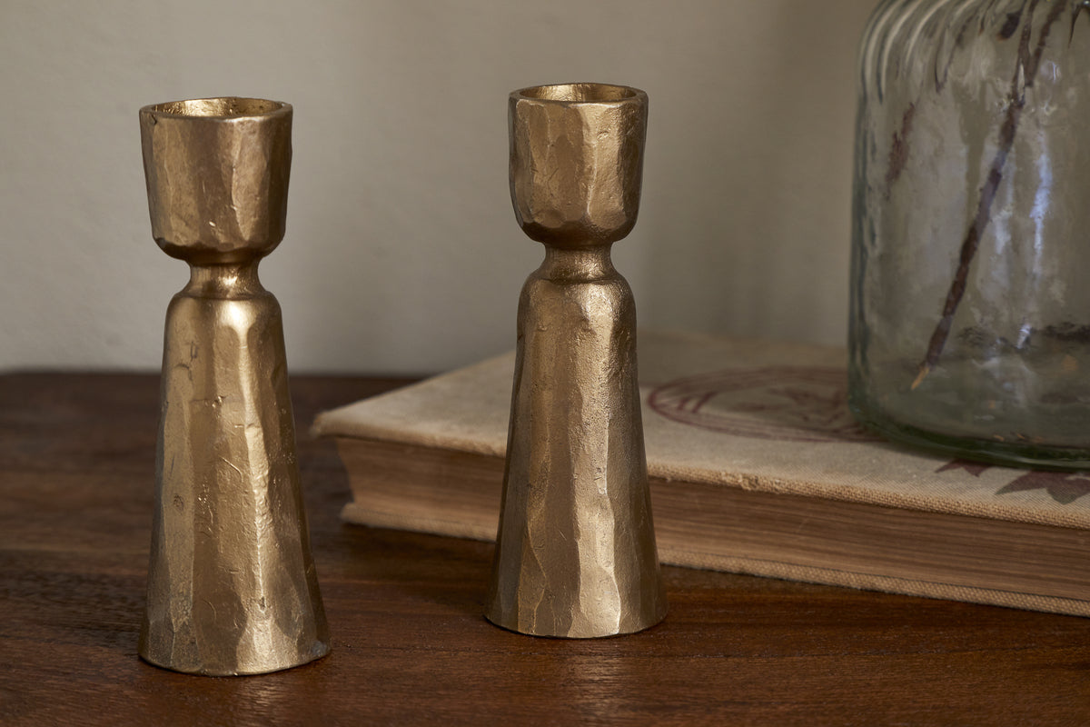 This set of two tapered candlestick holders, each in a slightly different size, brings a simple, elegant touch to any table setting. Their textured finish adds depth and their sleek design adds height and warmth, whether styled alone or as part of a considered centrepiece.