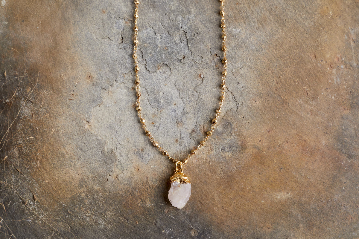 Each necklace is carefully crafted with a rough-cut rose quartz stone, hand-cut to preserve its natural shape and gentle translucency. The pendant is paired with a fine, gold-coloured chain made from a durable brass alloy, and delicately assembled by hand.