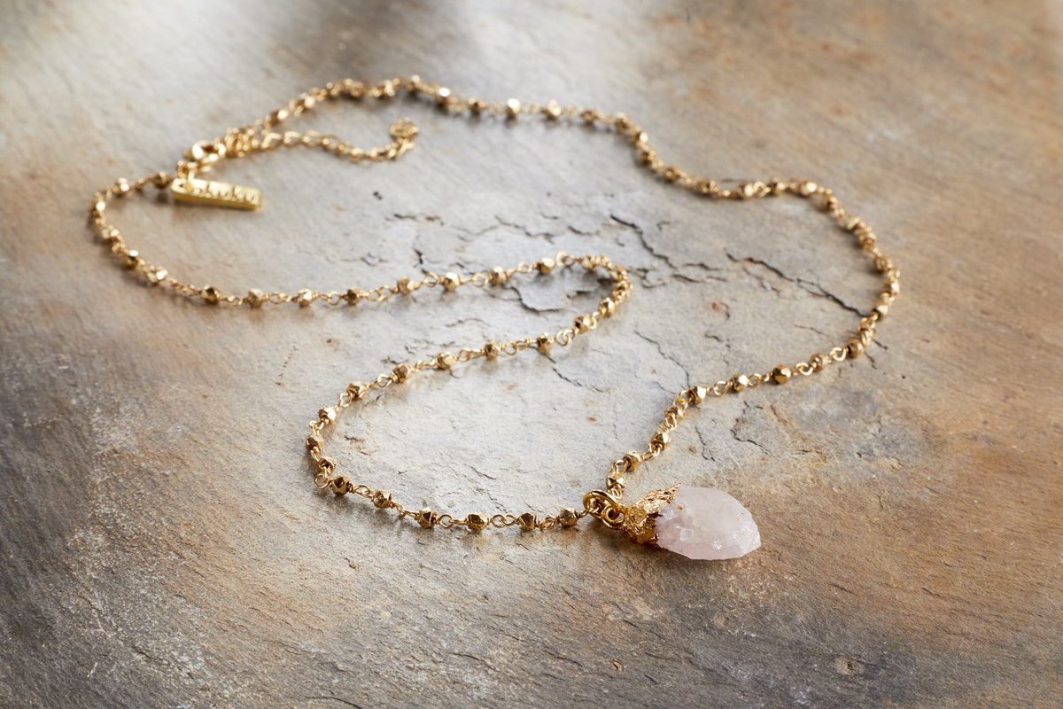 The nkuku Hadari Rose Quartz Necklace—featuring a raw, unpolished crystal pendant on a gold chain—rests on an earthy brown surface, showcasing the elegance of this unique jewellery piece.The nkuku Hadari Rose Quartz Necklace features a delicate gold chain with subtle beads and a rough teardrop-shaped rose quartz pendant, elegantly displayed on textured light brown stone—perfect for any occasion.Three elegant jewellery pieces on a stone surface: nkuku’s Hadari Rose Quartz Necklace – Gold, with a gold chain and rose quartz pendant, alongside two beaded necklaces in pink and cream marbled stones with gold accents.The nkuku Hadari Rose Quartz Necklace in gold features a delicate adjustable chain with a lobster clasp and an elegant oval-shaped rose quartz pendant—perfect for any occasion.