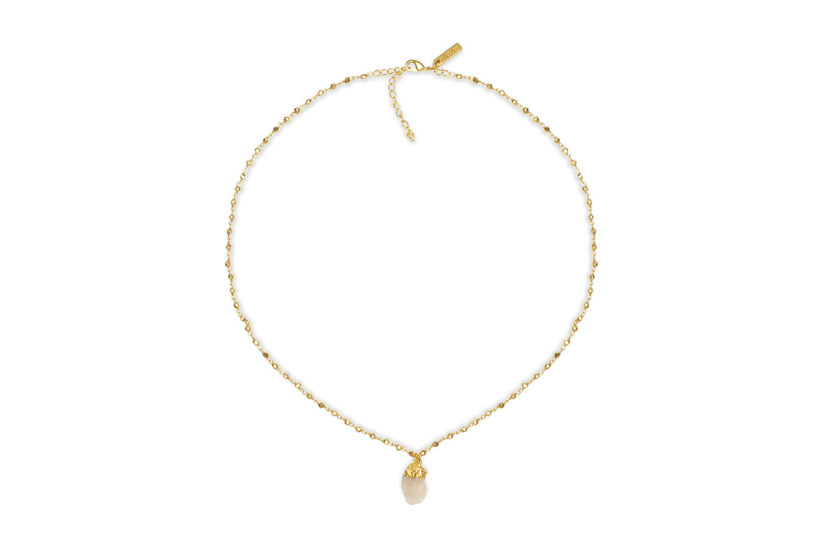 This elegant necklace introduces rose quartz to our jewellery collection. A rough-cut rose quartz stone takes centre stage, suspended from a fine gold-coloured chain that adds a delicate contrast to the natural form of the pendant. The soft, blush tone brings warmth and subtle colour to any outfit. Beautifully presented in a linen pouch, it-s a refined piece with everyday appeal.