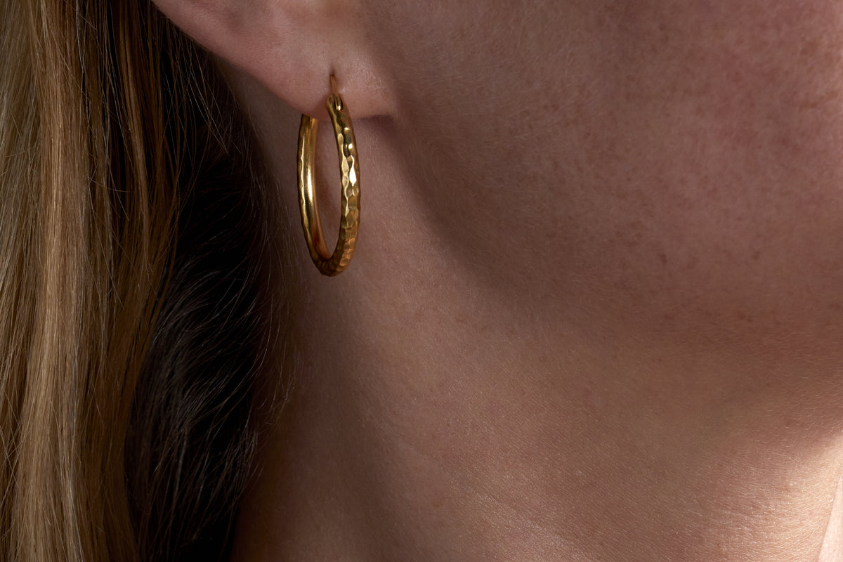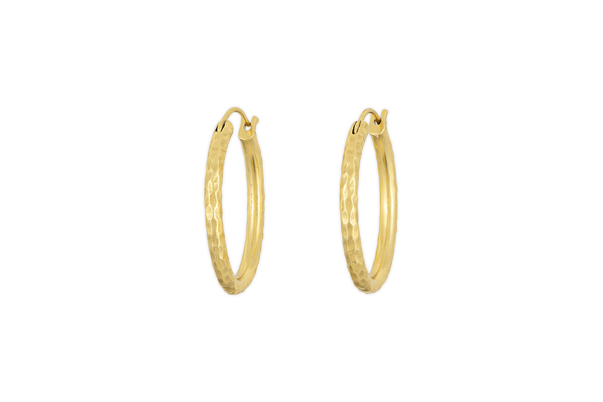 Each pair is handcrafted from a durable brass alloy and finished with a warm gold-coloured tone. The earrings are hand-hammered to create a subtly textured surface, giving every piece a unique character.