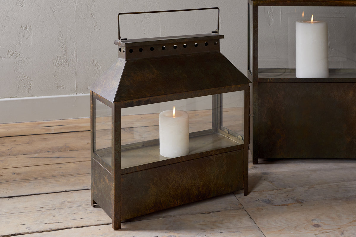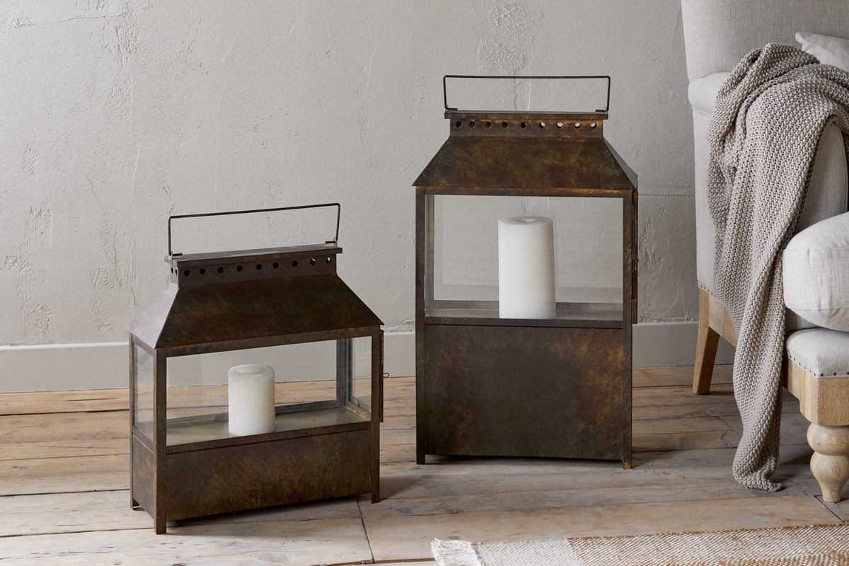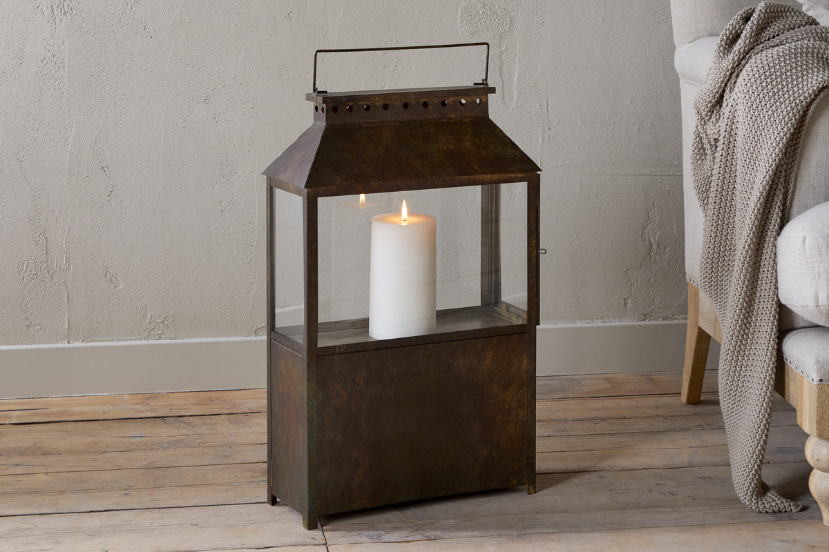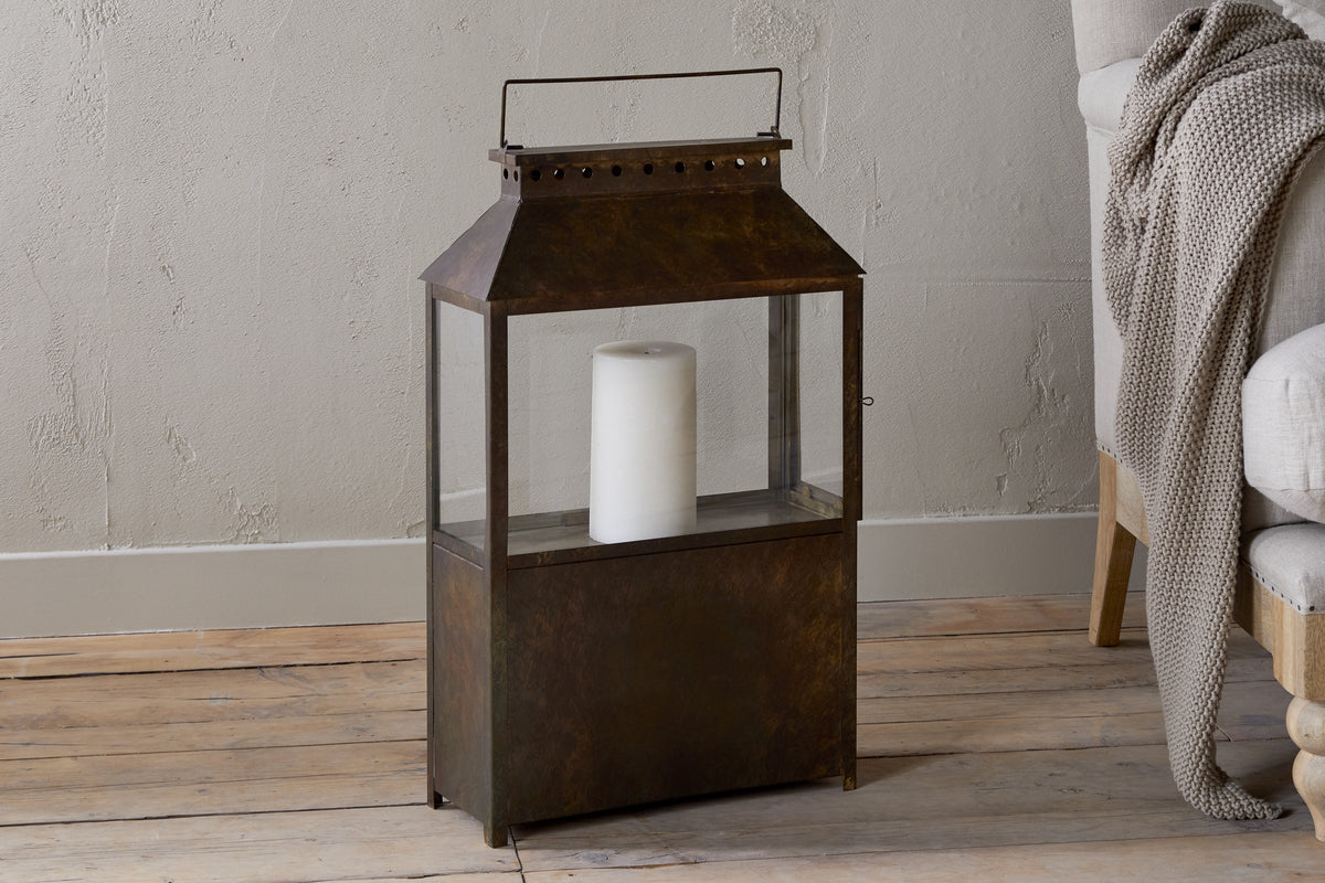 Part of our wide lantern collection, this piece features a solid lower section that gives it a grounded, substantial feel, ideal for floor display. Finished in a warm brown patina, it has an earthy, natural character that complements a variety of interior styles. Its versatile design makes it easy to style across a range of interiors. Available in two sizes.