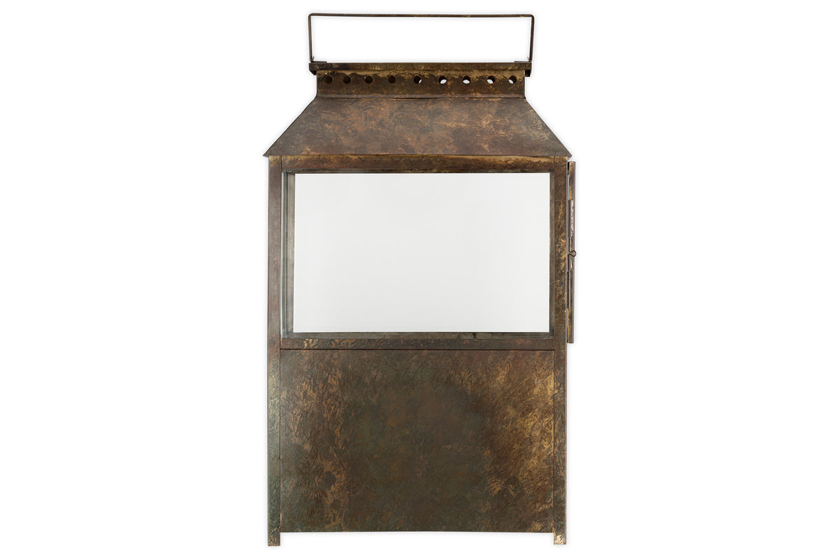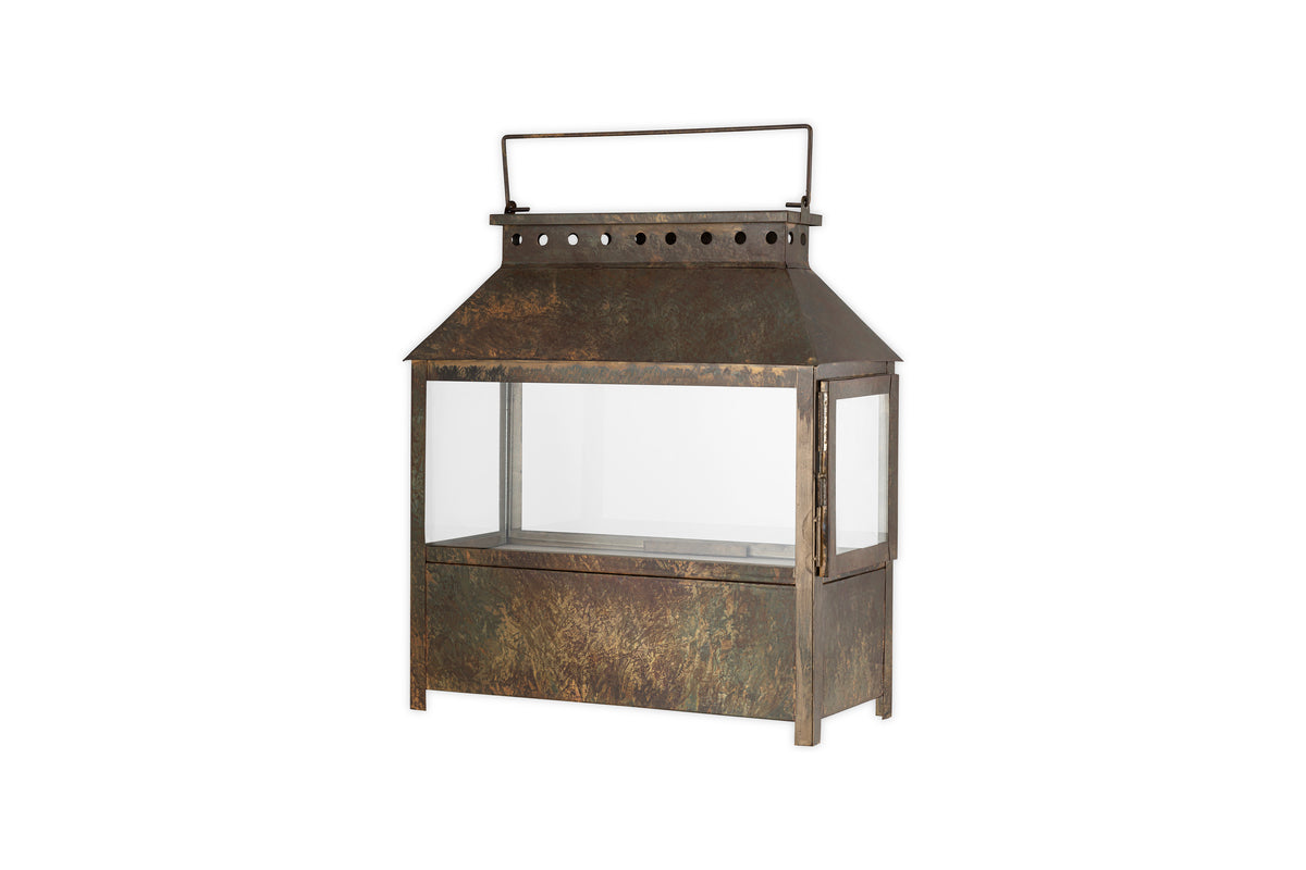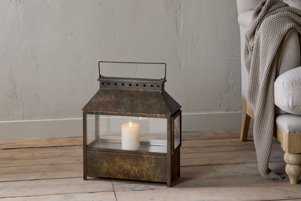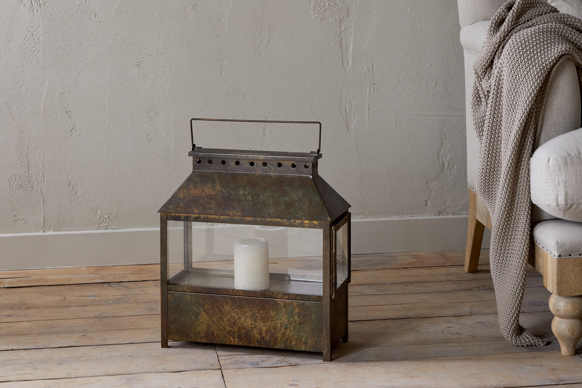 Part of our wide lantern collection, this piece features a solid lower section that gives it a grounded, substantial feel, ideal for floor display. Finished in a warm brown patina, it has an earthy, natural character that complements a variety of interior styles. Its versatile design makes it easy to style across a range of interiors. Available in two sizes.