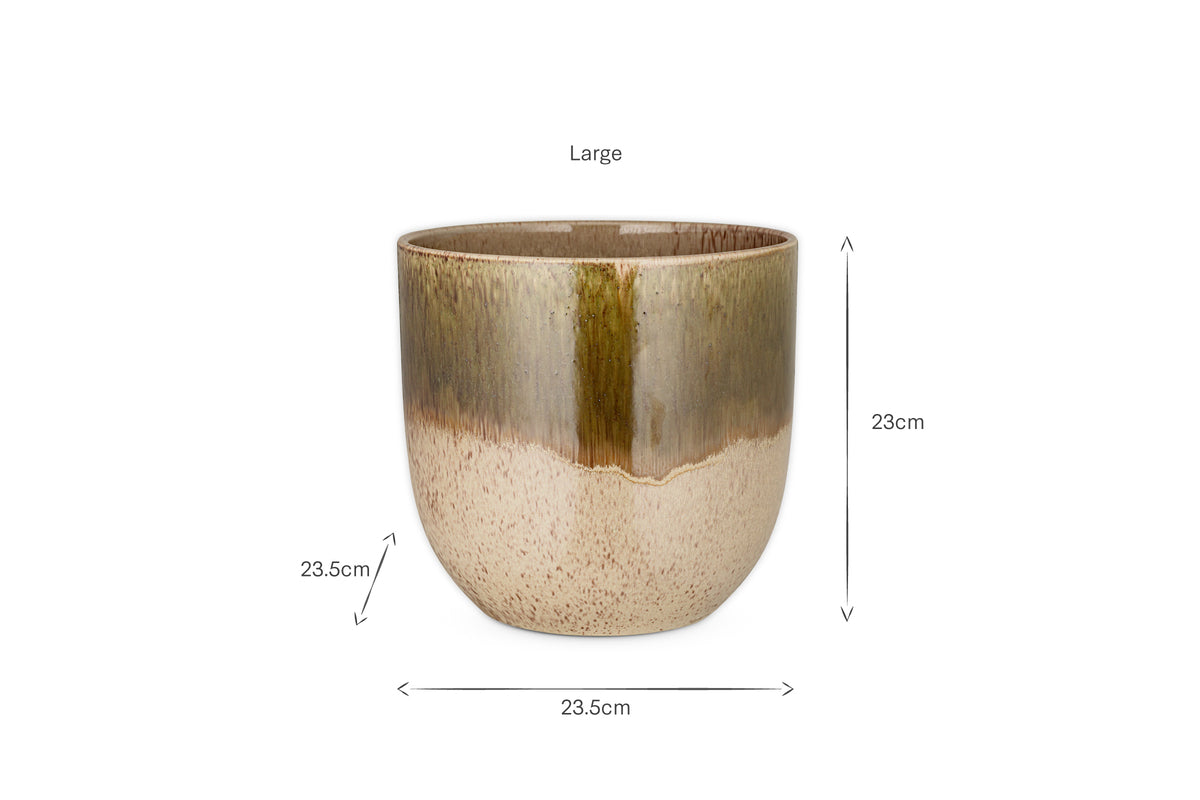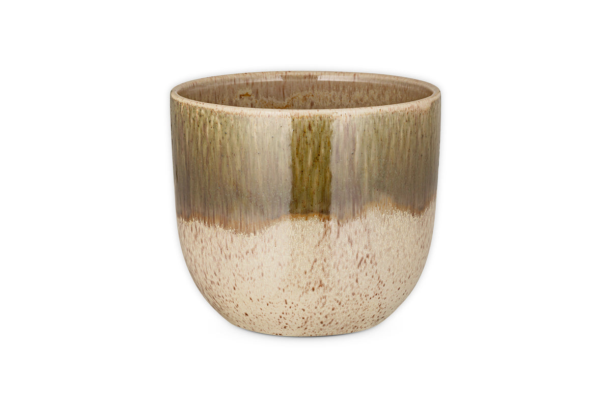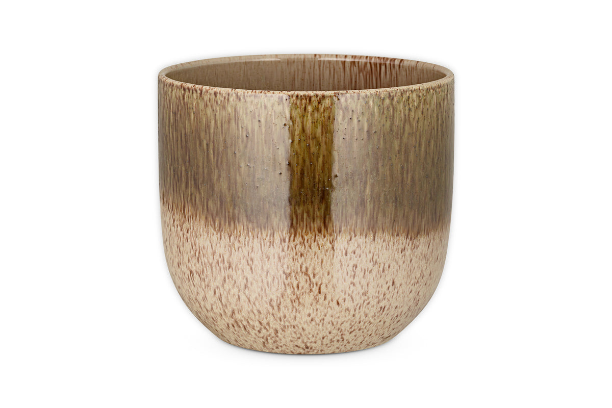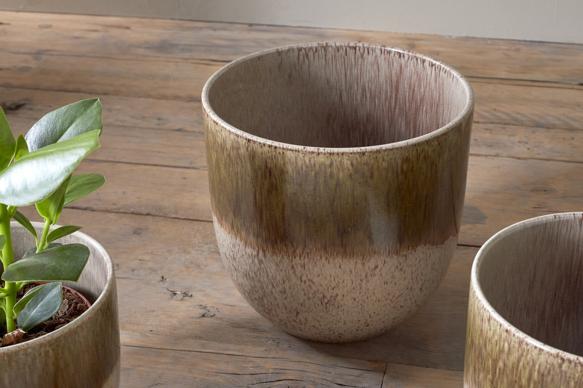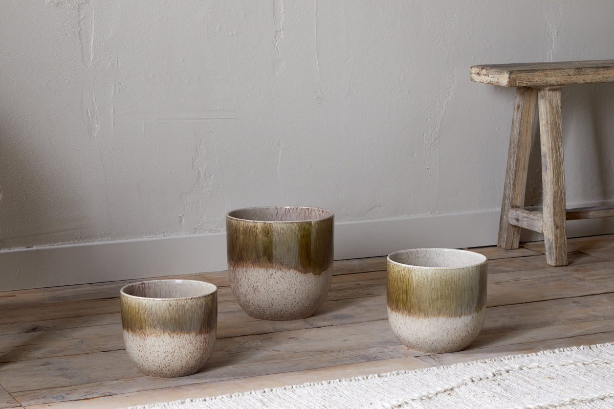 This planter features a muted, natural palette in two tonal glazes, finished with a speckled reactive glaze that makes each piece unique. Its understated, rustic design fits seamlessly into any setting, adding quiet character without overwhelming. Available in three sizes, it can be styled solo or grouped in sets of two or three for greater impact.