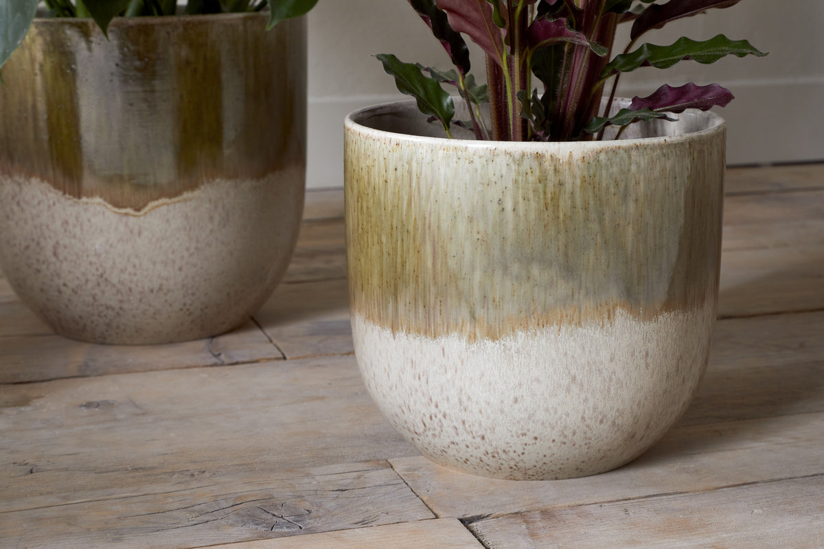 Each planter is hand-glazed using a reactive glaze technique that results in a unique, textured finish. As the glaze reacts in the heat of the kiln, it creates natural variations in tone and pattern, meaning no two pieces are exactly alike.