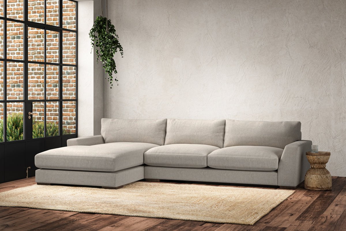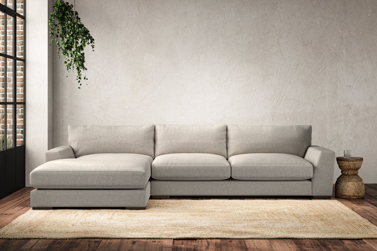 The laid-back sculptural shape of the Guddu large left hand chaise sofa brings effortless style to an interior. The generous arms and deep seat cushions make this collection the perfect choice for families or those that like a bit of extra space to stretch out. Details include separate back cushions, exceptional quality fabrics and solid wood block feet. Each piece is handcrafted by experts using traditional techniques for a quality finish that celebrates the best of British craftmanship.