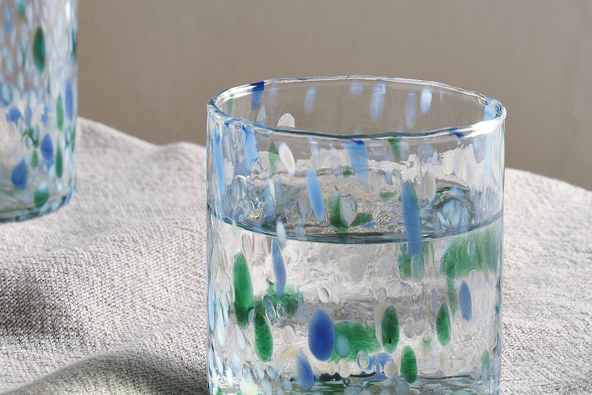 Each mouth-blown recycled glass Taja Tumbler brings a soft palette of fresh aqua tones in gentle blues and greens to instantly freshen up a table setting. Coloured glass fragments are introduced to the clear molten glass, creating a free-flowing design and unique finish that is also highly durable as the pattern is contained within the glass itself. The stylish, organic design, with its sturdy form and gently uneven rim, heightens the individual beauty of each glass.