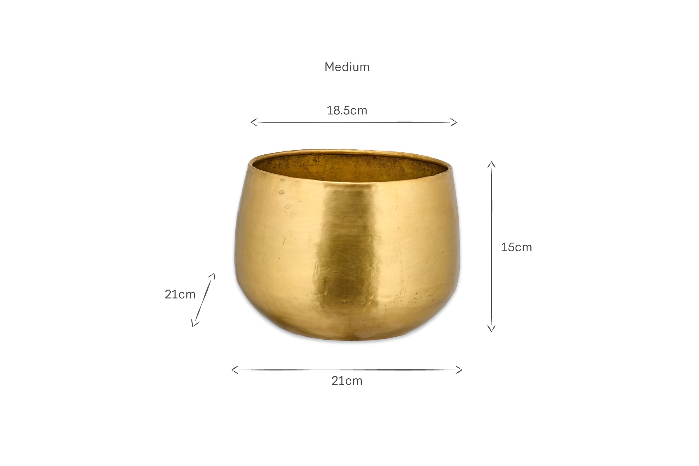 This stylish Atsu brass planter has a smooth finish and curved shape, with the golden brass hues adding to its sophisticated look. To create a eye-catching display style in trios with a mix of sizes and varieties of house plant.