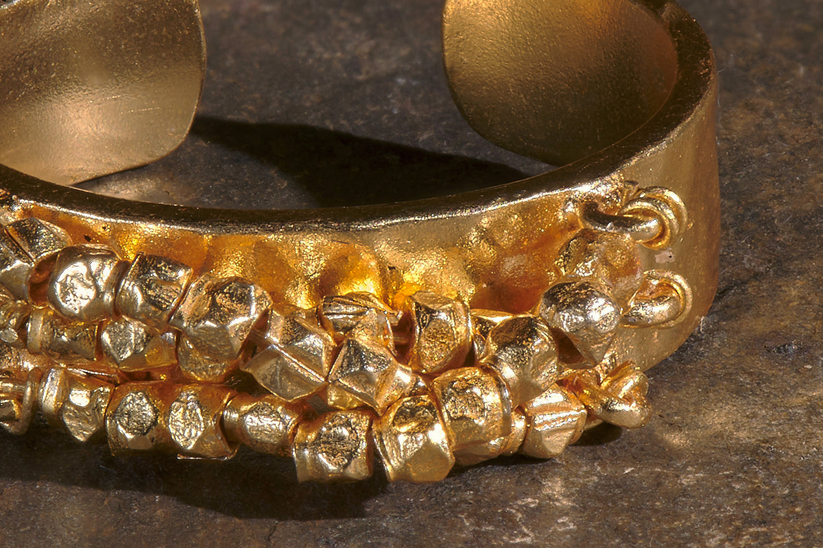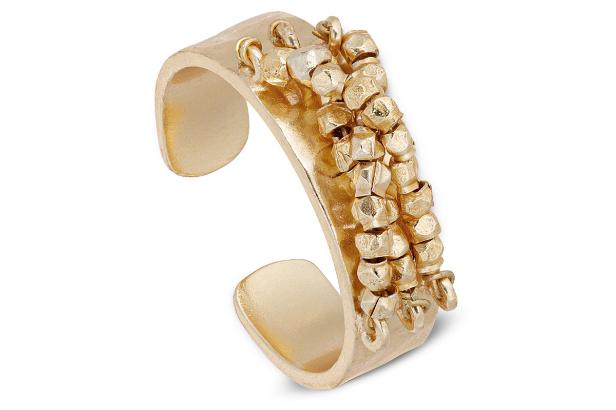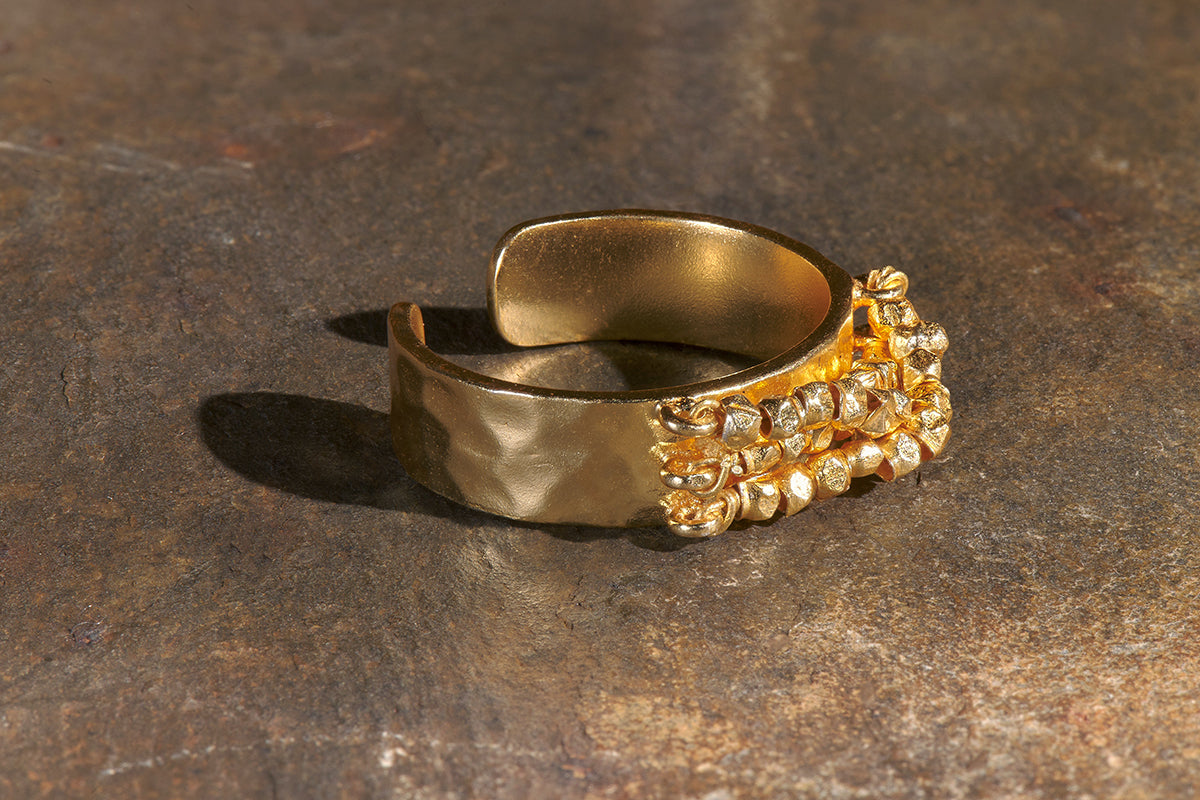 Striking and bold, the warm gold plated Mula ring combines strings of intricately hand cut brass alloy beads on a thick band. Ideal for eveningwear or dressing up a daytime look with a little sparkle, the band is incomplete for ease of fitting. Hypoallergenic and nickel free. Mula earrings are available.