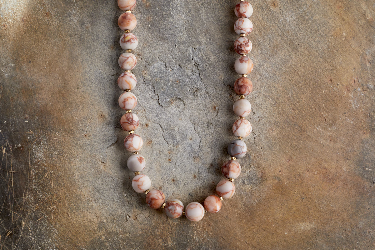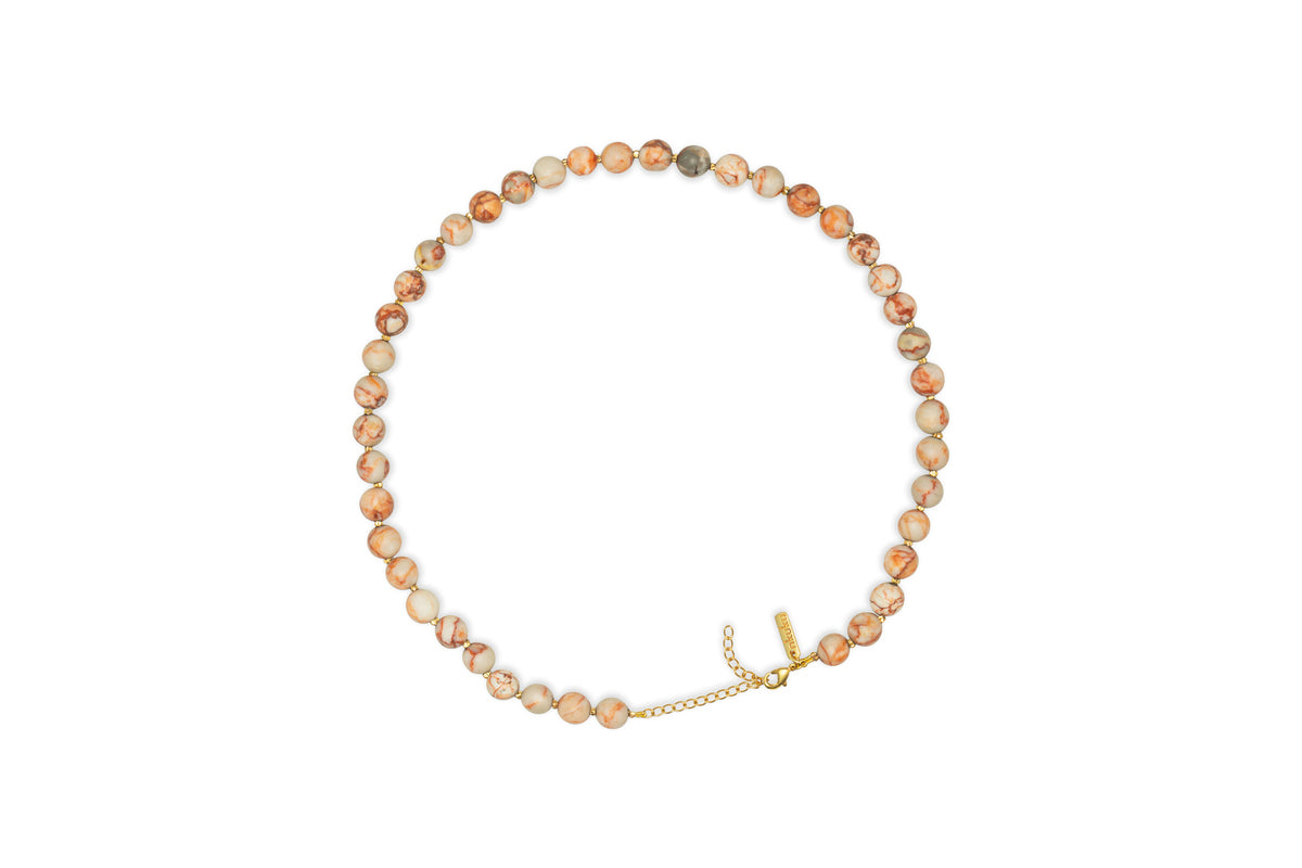 This beaded necklace introduces a new semi-precious stone to the collection, chosen for its soft, seasonal tones and natural elegance. The refined, tactile design layers beautifully with other pieces or makes a subtle statement on its own. Packaged in a linen pouch, it's a versatile accessory that works effortlessly with both everyday and elevated looks.