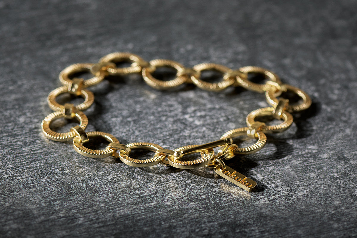 This simple yet striking statement piece is made from hand-etched, interwoven warm gold plated links. The chunky chain is made of brass alloy with gold plating and has a cool contemporary appearance with bar closure. Made to partner the Hara Onyx necklace. Hypoallergenic and nickel free.