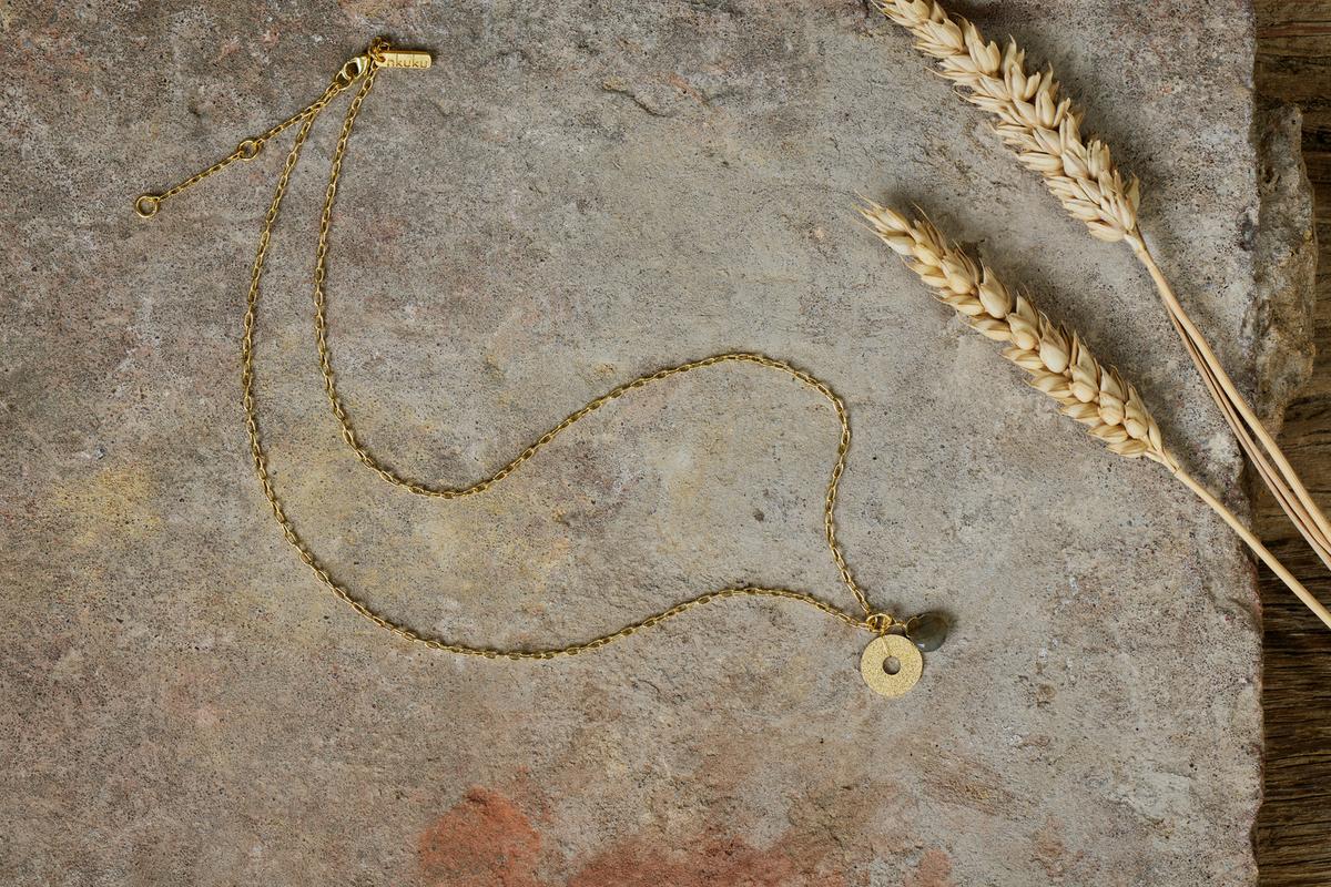 Our Hiral drop necklace is stylish and eye-catching. A delicate disc with an intricate cut-out detail sits alongside a beautiful labradorite stone, both of which are gently suspended from a warm golden hued chain. The natural labradorite stone has a striking iridescent sheen which is enhanced by the skillful way it has been cut and polished, using traditional methods that have stood the test of time. Suitable for both day and evening wear, this necklace is hypoallergenic and nickel-free, with gold plating.