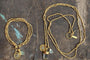Our stunning charm bracelet has a long legacy with Nkuku and is handmade in Rajasthan. The charm drop is made from Prehnite, the round disc from Labradorite and the necklace from pieces of crystal quartz. Each natural stone is cut and polished by hand. The chain is made from hand cut metal beads plated in 22k gold.