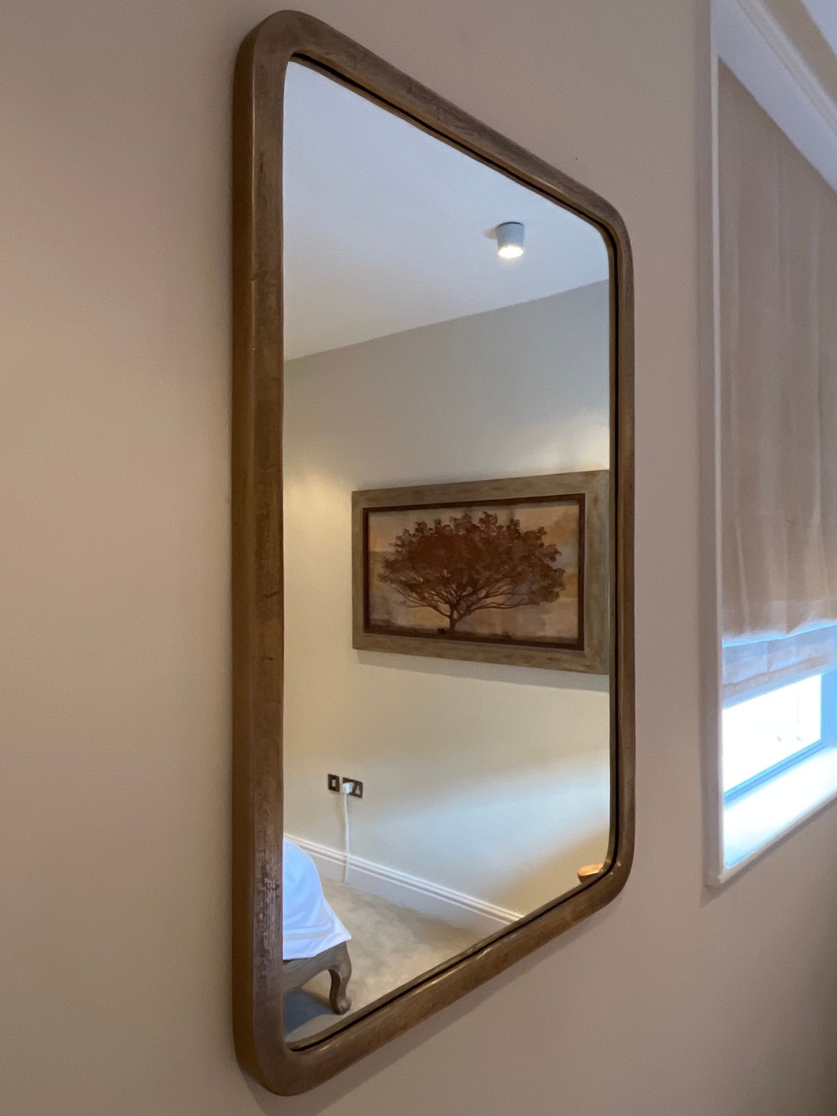 Our Ungura rounded mirror is a masterpiece of both craftsmanship and style. Handcrafted from cast aluminium, it boasts an imperfect textured finish achieved by being shaped and moulded using sand casting, an environmentally-friendly process that allows nearly every material to be recycled. Its soft, rounded edges and elegant brass colour add a stylish charm to any space. Designed for portrait hanging, it is an ideal choice for your bedroom or bathroom. Available in two sizes.