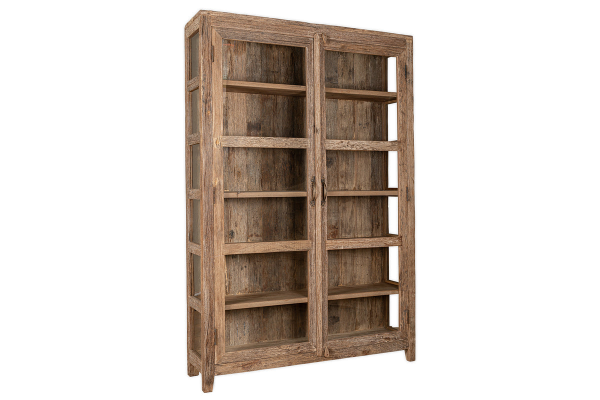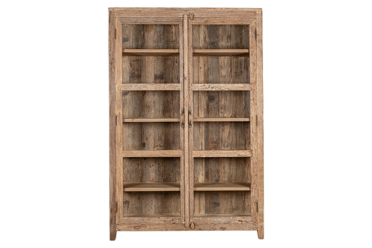 This rustic cabinet combines practical storage with timeless character. Designed with a simple, sturdy frame, it features six spacious shelves, ideal for organising pantry items, books, vases, or display pieces. Glass panels on the front and sides create a light, open feel, while antique brass handles add a touch of vintage charm. A versatile piece that brings warmth, texture, and functionality to any room.