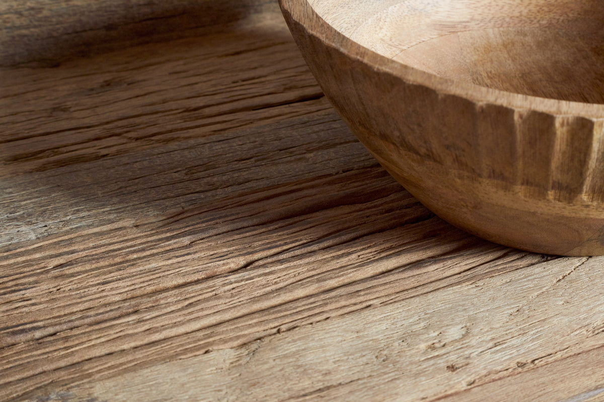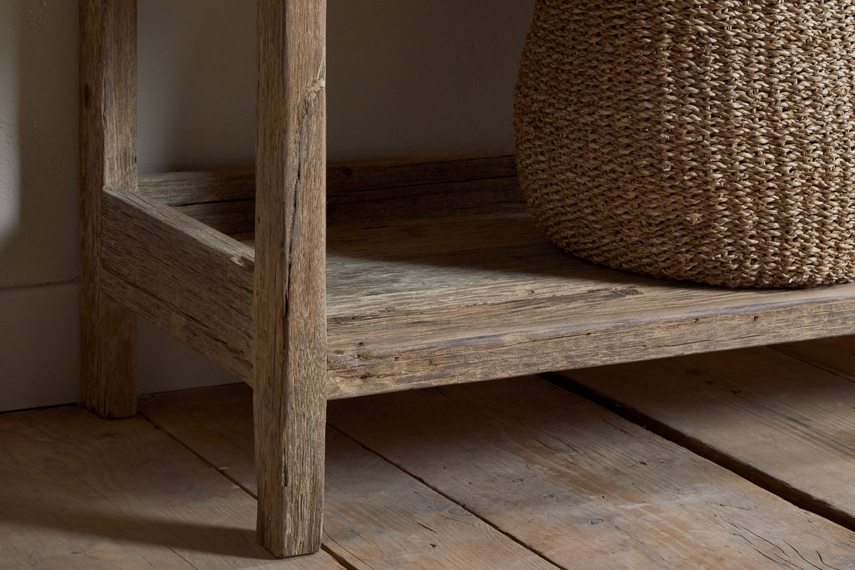 Crafted from reclaimed wood once used on traditional Indian transport trucks, these kitchen shelves carry the history of the roads they once travelled. The wood is carefully selected for its rich texture, natural grain, and weathered character and hand-assembled by skilled makers.