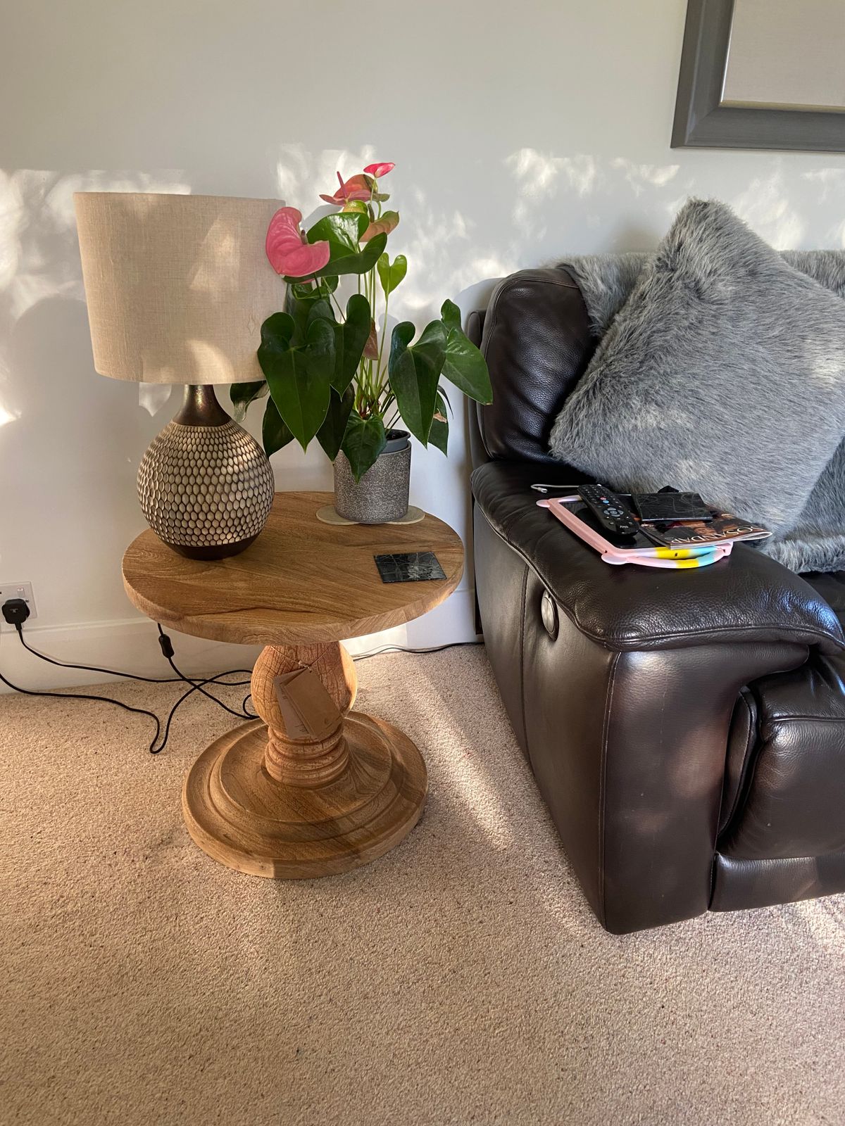 With its distinctive silhouette and compact proportions, the Laya side table makes a refined accent in any room. The circular tabletop rests on an elegantly shaped base, creating a balanced and sculptural form. A raw wood finish enhances the natural grain and knots, bringing warmth and texture to your space, perfect beside a sofa, armchair, or bed.