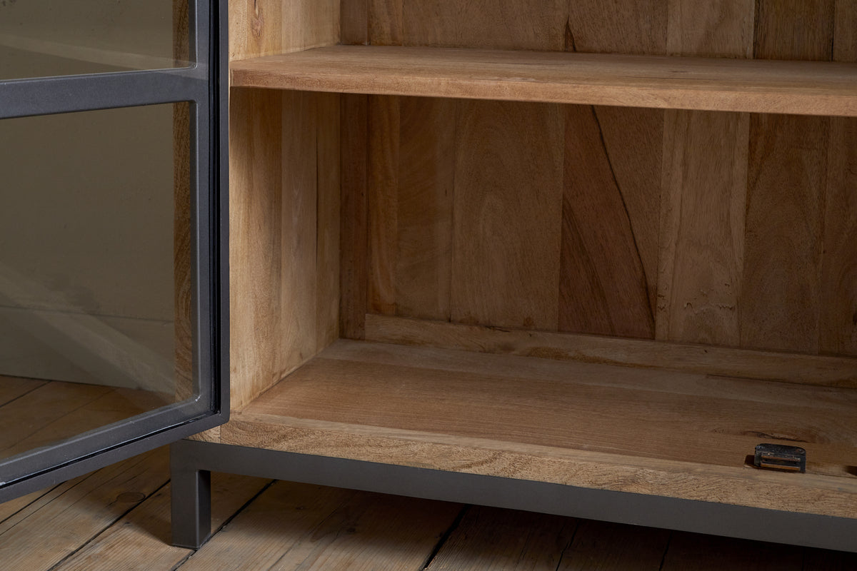 The nkuku Nirvi Mango Wood & Iron Sideboard - Black features glass doors showcasing bowls, baskets, and linens. On top sit a vase with dried flowers and bowls. The sideboard stands on a wooden floor against a neutral wall.The nkuku Nirvi Mango Wood & Iron Sideboard - Black features black metal-framed glass doors that open to display wooden bowls, a pitcher, and baskets inside, while pottery and dried grasses decorate the top.The nkuku Nirvi Mango Wood & Iron Sideboard - Black features glass doors displaying glassware and plates. A black vase with branches and framed art sit atop, next to a window and beige sofa on a woven rug in a sunlit room.The Nirvi Mango Wood & Iron Sideboard - Black by nkuku, featuring black metal-framed glass doors, stands beside a window in a bright room. One door is open to show a shelf inside; a light armchair and rug are partly visible.The nkuku Nirvi Mango Wood & Iron Sideboard - Black features glass-front double doors and a black frame, standing on a wooden floor against a light wall in a minimalist room with part of a round table and upholstered chair visible on the left.The Nirvi Mango Wood & Iron Sideboard by nkuku, featuring glass doors and a single shelf, sits open on a wooden floor beside a round table and cushioned chair in a softly lit room with textured walls.Close-up of the Nirvi Mango Wood & Iron Sideboard - Black by nkuku, showing the glass door with a black metal frame, set against a light wall.Close-up of the Nirvi Mango Wood & Iron Sideboard by nkuku, showcasing its natural mango wood grain, modern black iron edges, and legs—blending industrial style with rustic charm. Ceramic bowl displayed on top.A close-up of the nkuku Nirvi Mango Wood & Iron Sideboard in black, featuring an empty single shelf and a partially open glass door that highlights the natural grain and texture of mango wood.A close-up of the nkuku Nirvi Mango Wood & Iron Sideboard in black, featuring a metal frame, open glass door, and two shelves on a wooden floor. A small metal object sits on the bottom shelf.Close-up of the Nirvi Mango Wood & Iron Sideboard - Black by nkuku, showcasing its light mango wood grain, black iron frame, and glass panel door, set on a rustic wooden floor with natural texture.Close-up of two black metal handles on the glass cabinet doors of the nkuku Nirvi Mango Wood & Iron Sideboard - Black, showcasing the detailed texture of its iron and mango wood surfaces and wooden interior shelves.The Nirvi Mango Wood & Iron Sideboard - Black by nkuku features two glass doors, two interior shelves, a natural mango wood finish, a sturdy black metal frame, and four robust metal legs for an industrial look.The nkuku Nirvi Mango Wood & Iron Sideboard - Black features two glass doors, metal frame accents, an interior shelf, and stands on four short metal legs against a white background.The nkuku Nirvi Mango Wood & Iron Sideboard - Black features a light natural mango wood finish, simple panel details, a flat top, and black metal legs, shown here against a white background.