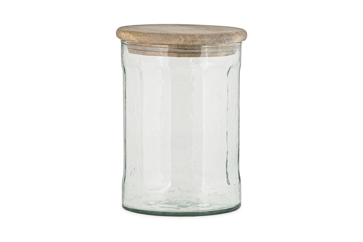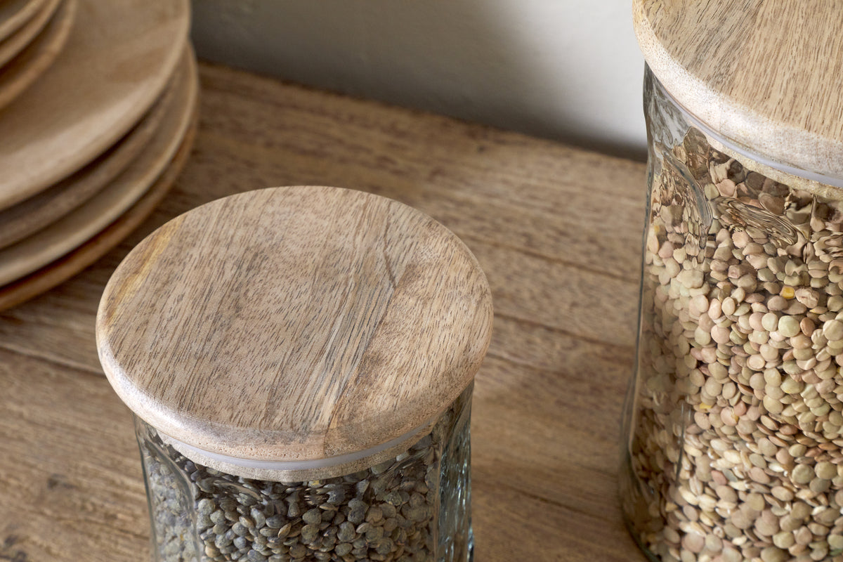 A practical and stylish storage solution, this jar features a clear glass body that keeps contents visible and easy to access. The smooth mango wood lid has a secure seal, helping to keep dry goods fresh. Its vintage-inspired shape and natural finish make it a versatile addition to any kitchen, perfect for everything from pasta to pulses.
